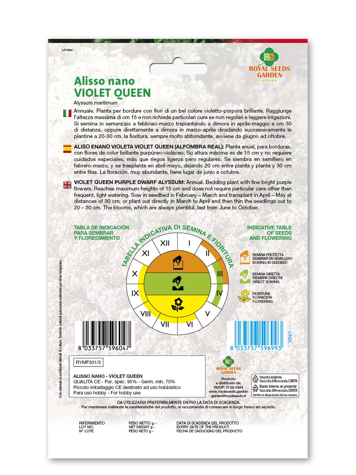 Dwarf alyssum violet queen – Annual. Bedding plant with fine bright purple flowers. Reaches maximum heights of 15 cm and does not require particular care other than frequent, light watering. Sow in seedbed in February – March and transplant in April – May at distances of 30 cm, or plant out directly in March to April and then thin the seedlings out to 20 – 30 cm. The blooms, which are always plentiful, last from June to October.
