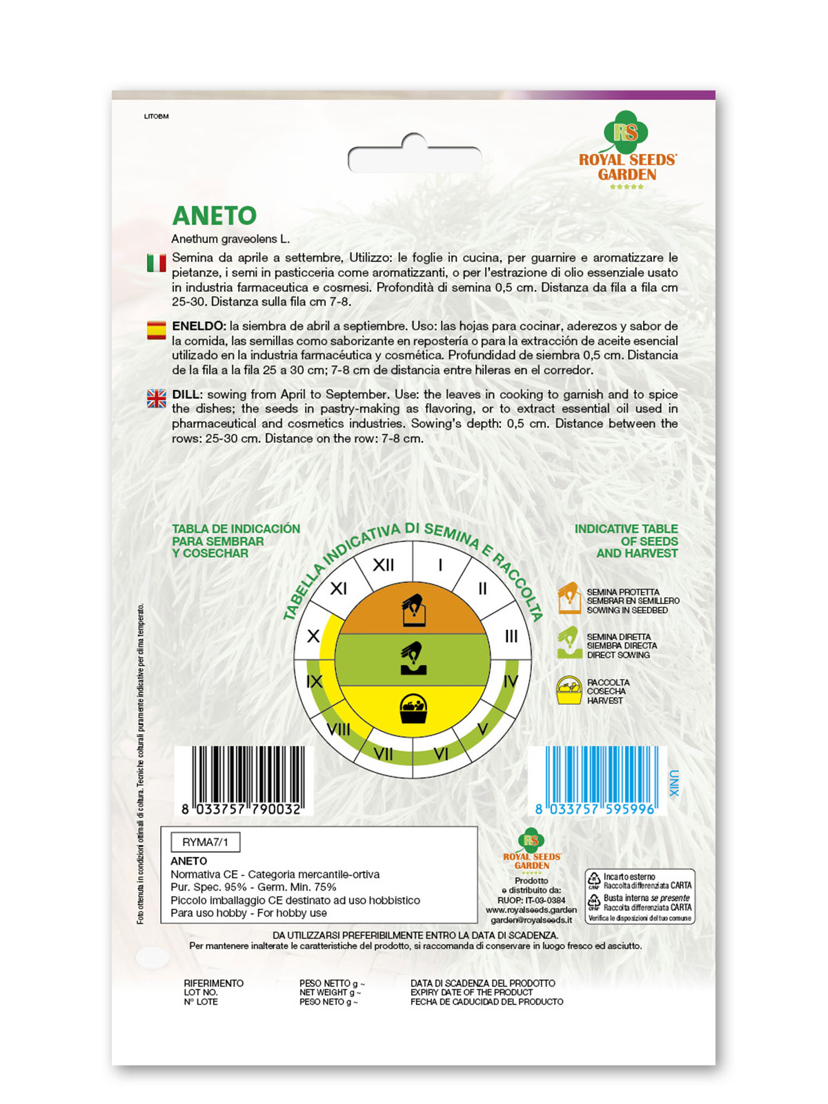 Aneto – Semina da aprile a settembre, Utilizzo: le foglie in cucina, per guarnire e aromatizzare le pietanze, i semi in pasticceria come aromatizzanti, o per l’estrazione di olio essenziale usato in industria farmaceutica e cosmesi. Profondità di semina 0,5 cm. Distanza da fila a fila cm 25-30. Distanza sulla fila cm 7-8.