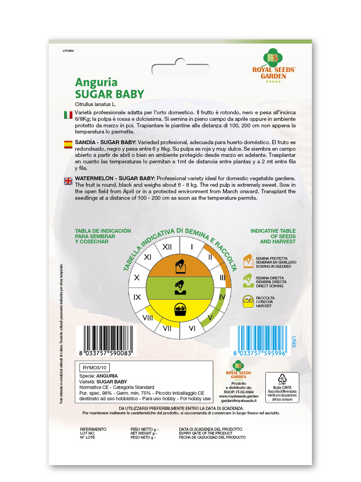 6/8Kg; la polpa è rossa e dolcissima. Si semina in pieno campo da aprile oppure in ambiente protetto da marzo in poi. Trapiantare le piantine alla distanza di 100, 200 cm non appena la temperatura lo permette.