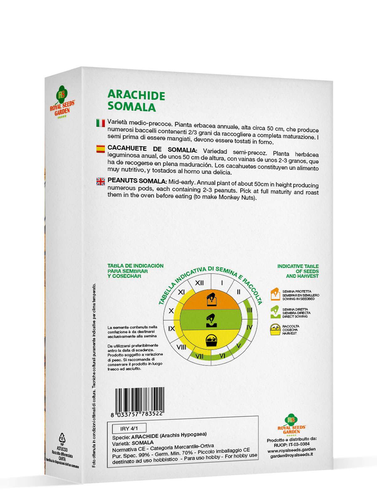 Arachide Somala – Varietà medio-precoce. Pianta erbacea annuale, alta circa 50 cm, che produce numerosi baccelli contenenti 2/3 grani da raccogliere a completa maturazione. I semi prima di essere mangiati, devono essere tostati in forno.