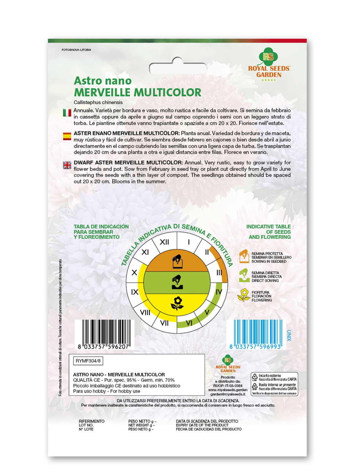 Astro nano merveille multicolor – Annuale. Varietà per bordura e vaso, molto rustica e facile da coltivare. Si semina da febbraio in cassetta oppure da aprile a giugno sul campo coprendo i semi con un leggero strato di torba. Le piantine ottenute vanno trapiantate o spaziate a cm 20 x 20. Fiorisce nell’estate.
