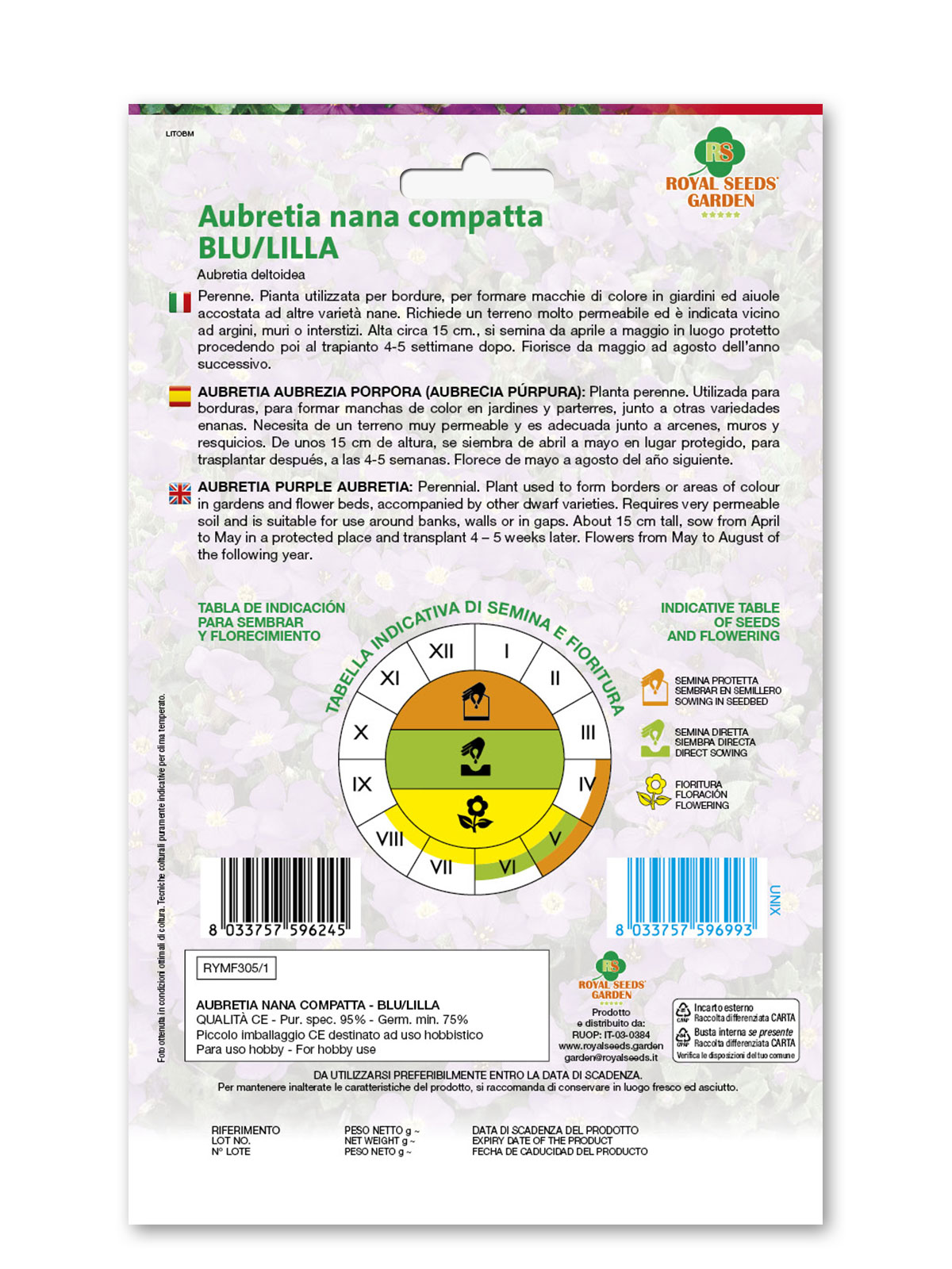 Aubretia compact dwarf Blue/lilac – Perennial. Plant used to form borders or areas of colour in gardens and flower beds, accompanied by other dwarf varieties. Requires very permeable soil and is suitable for use around banks, walls or in gaps. About 15 cm tall, sow from April to May in a protected place and transplant 4 – 5 weeks later. Flowers from May to August of the following year.