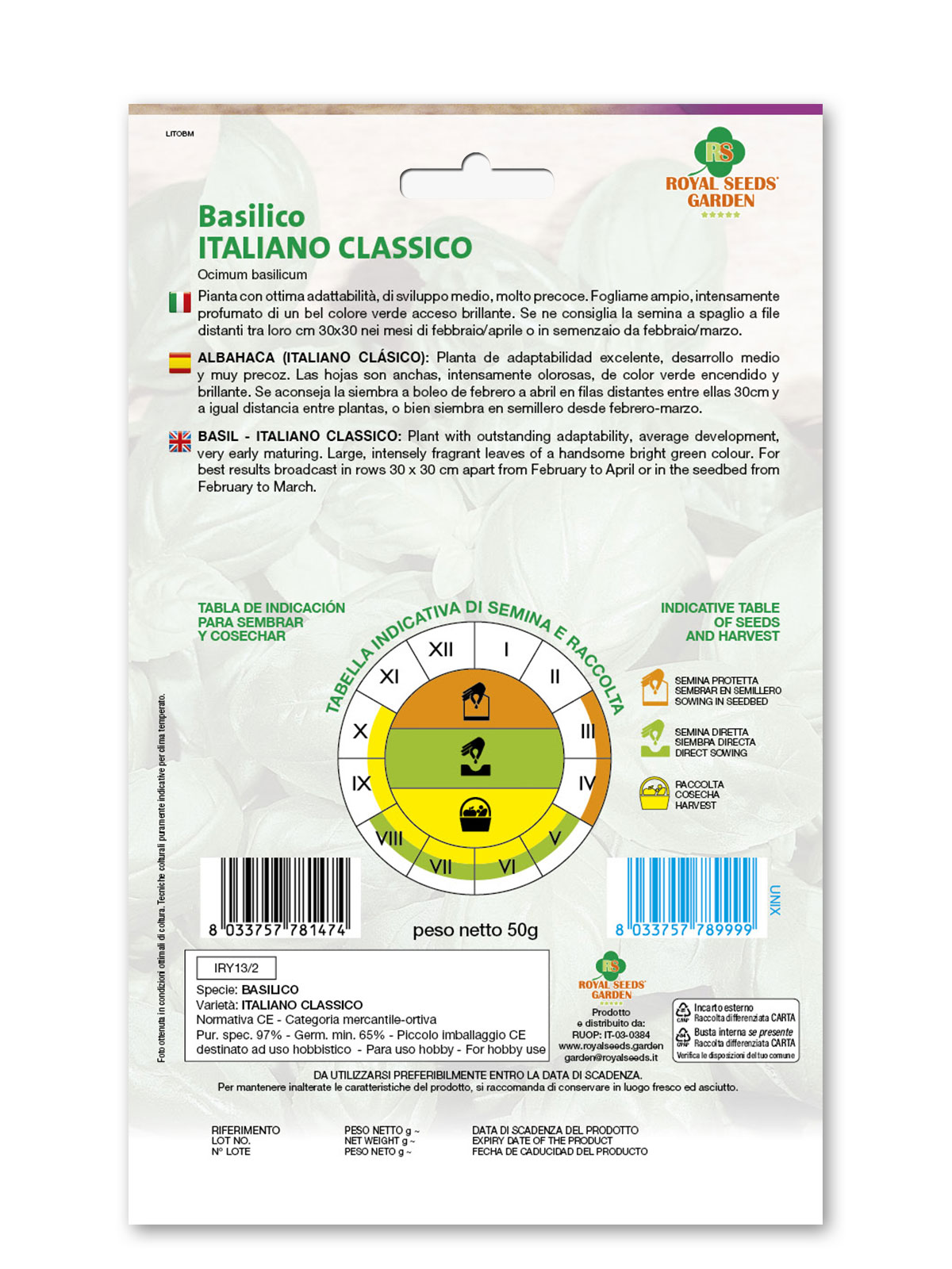Basilico a foglia di lattuga – Pianta rustica e vigorosa, di medie dimensioni (circa 50 cm.). Le foglie molto ampie, bollose e profumate sono di un bel colore verde medio intenso, e vengono impiegate per l’uso alimentare in cucina o per la preparazione di essenze ed infusi. La semina in semenzaio si esegue da Marzo-Aprile. La semina in pieno campo si effettua da Maggio ad Agosto a file distanti tra di loro cm. 30 e cm. 20 sulle file.