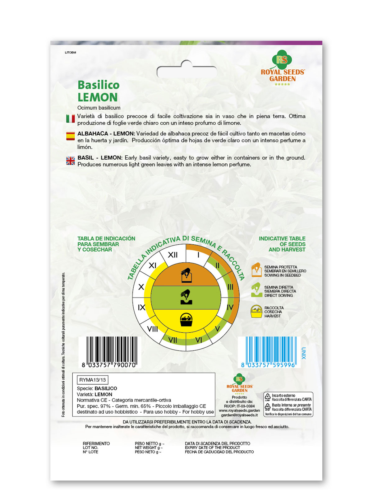 Basilico Lemon – Varietà di basilico precoce di facile coltivazione sia in vaso che in piena terra. Ottima produzione di foglie verde chiaro con un inteso profumo di limone.