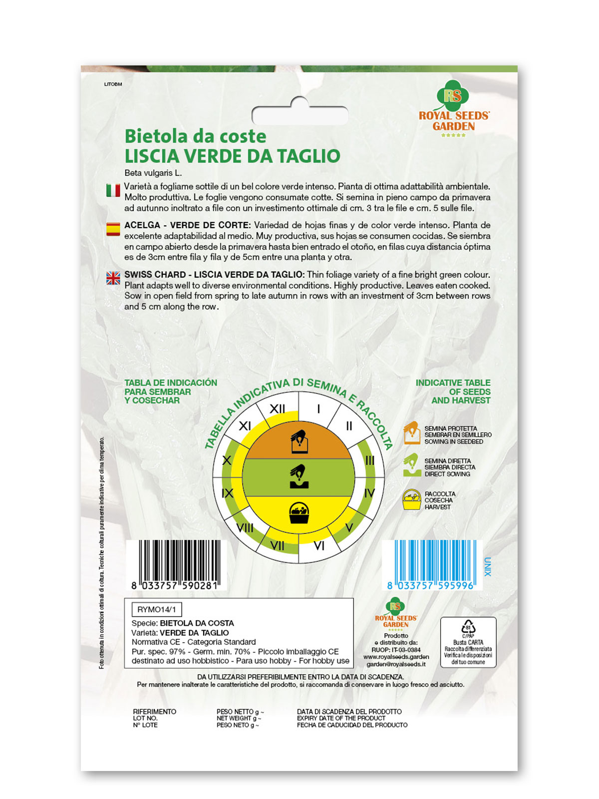 Bietola da coste liscia verde da taglio – Varietà a fogliame sottile di un bel colore verde intenso. Pianta di ottima adattabilità ambientale. Molto produttiva. Le foglie vengono consumate cotte. Si semina in pieno campo da primavera ad autunno inoltrato a file con un investimento ottimale di cm. 3 tra le file e cm. 5 sulle file.