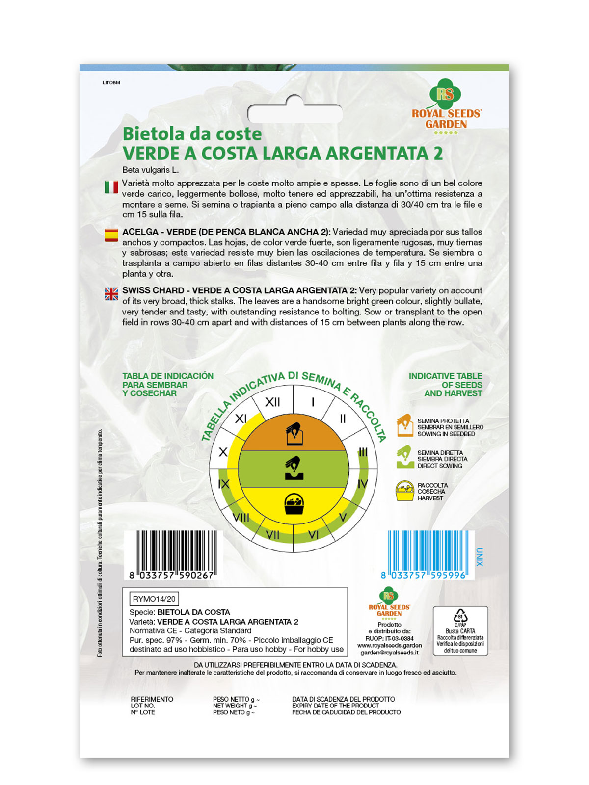 Bietola da coste verde a costa larga argentea 2 – Varietà molto apprezzata per le coste molto ampie e spesse. Le foglie sono di un bel colore verde carico, leggermente bollose, molto tenere ed apprezzabili, ha un’ottima resistenza a montare a seme. Si semina o trapianta a pieno campo alla distanza di 30/40 cm tra le file e cm 15 sulla fila.