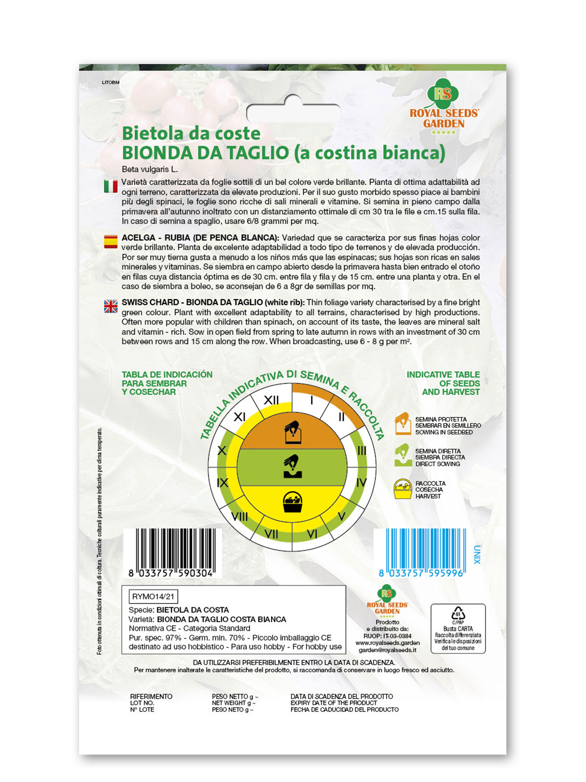 Bietola da coste bionda da taglio – Varietà caratterizzata da foglie sottili di un bel colore verde brillante. Pianta di ottima adattabilità ad ogni terreno, caratterizzata da elevate produzioni. Per il suo gusto morbido spesso piace ai bambini più degli spinaci, le foglie sono ricche di sali minerali e vitamine. Si semina in pieno campo dalla primavera all’autunno inoltrato con un distanziamento ottimale di cm 30 tra le file e cm.15 sulla fila. In caso di semina a spaglio, usare 6/8 grammi per mq.