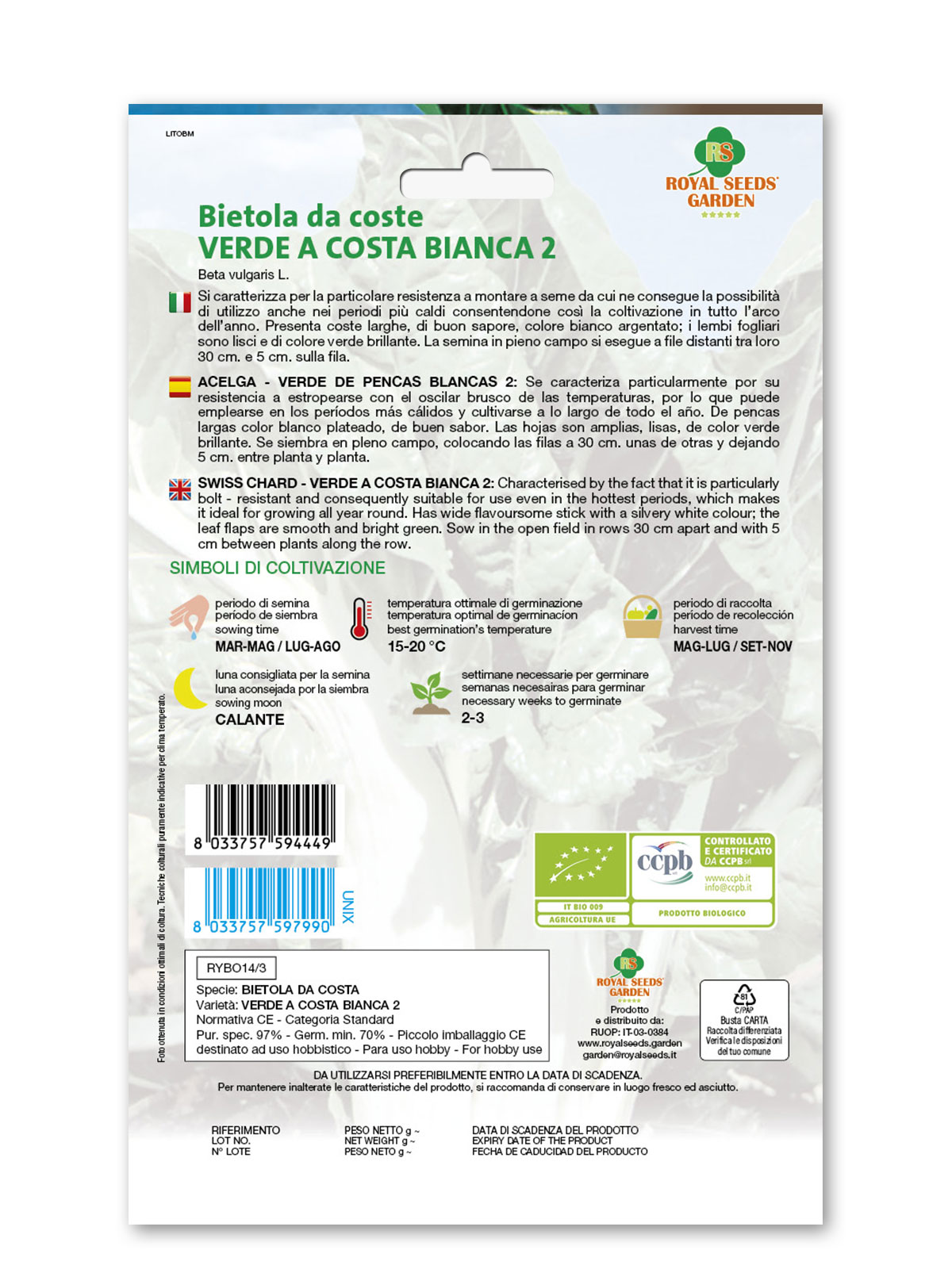 Bietola da coste Verde a costa bianca 2 – Si caratterizza per la particolare resistenza a montare a seme da cui ne consegue la possibilità di utilizzo anche nei periodi più caldi consentendone così la coltivazione in tutto l’arco dell’anno. Presenta coste larghe, di buon sapore, colore bianco argentato; i lembi fogliari sono lisci e di colore verde brillante. La semina in pieno campo si esegue a file distanti tra loro 30 cm. e 5 cm. sulla fila.