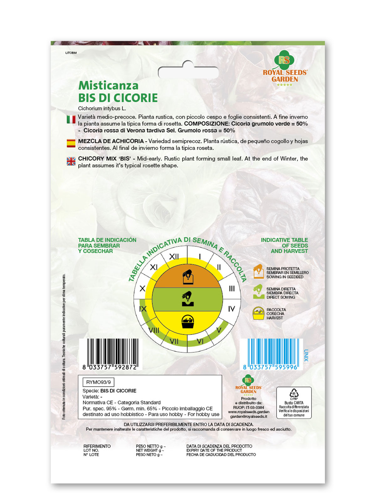 Misticanza bis di cicorie – Varietà medio-precoce. Pianta rustica, con piccolo cespo e foglie consistenti. A fine inverno la pianta assume la tipica forma di rosetta.