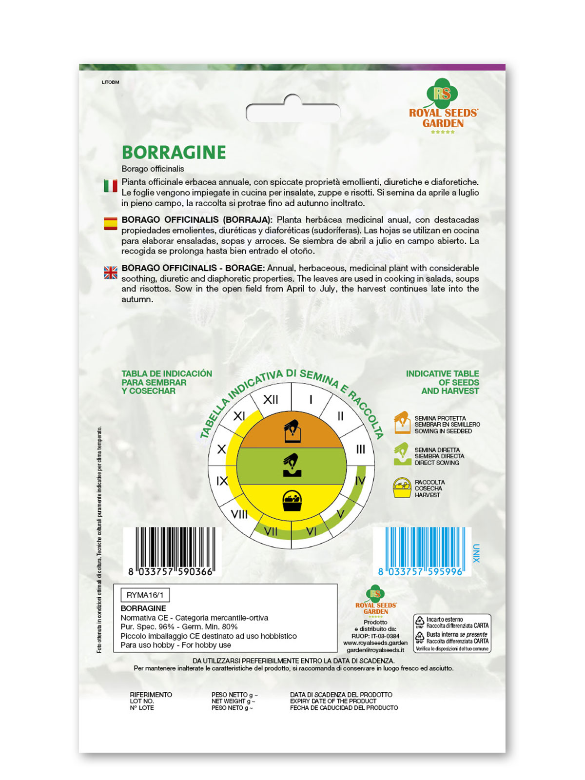 Borragine – Pianta officinale erbacea annuale, con spiccate proprietà emollienti, diuretiche e diaforetiche. Le foglie vengono impiegate in cucina per insalate, zuppe e risotti. Si semina da aprile a luglio in pieno campo, la raccolta si protrae fino ad autunno inoltrato.
