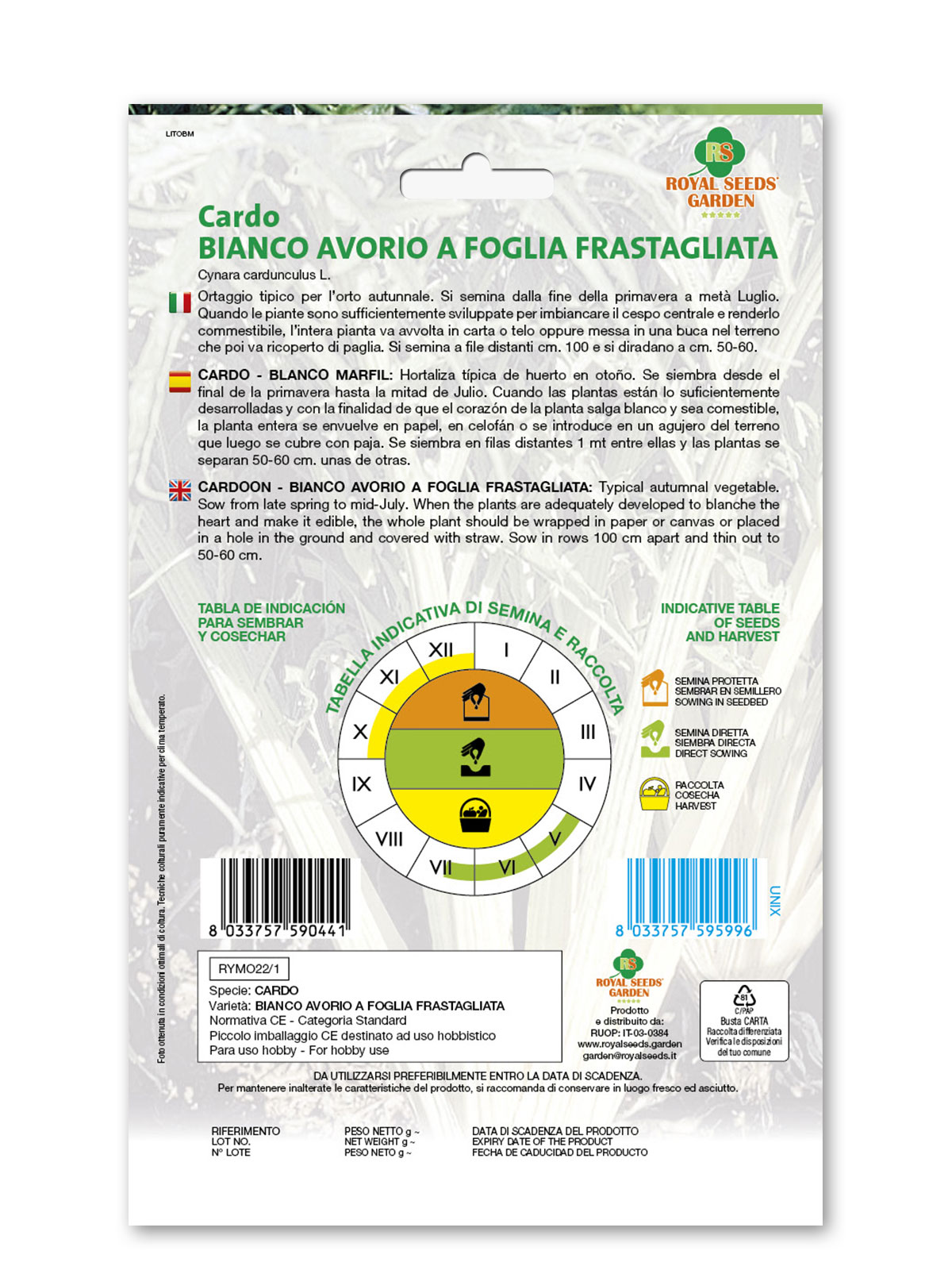 Cardo bianco avorio a foglia frastagliata – Ortaggio tipico per l’orto autunnale. Si semina dalla fine della primavera a metà Luglio. Quando le piante sono sufficientemente sviluppate per imbiancare il cespo centrale e renderlo commestibile, l’intera pianta va avvolta in carta o telo oppure messa in una buca nel terreno che poi va ricoperto di paglia. Si semina a file distanti cm. 100 e si diradano a cm. 50-60.