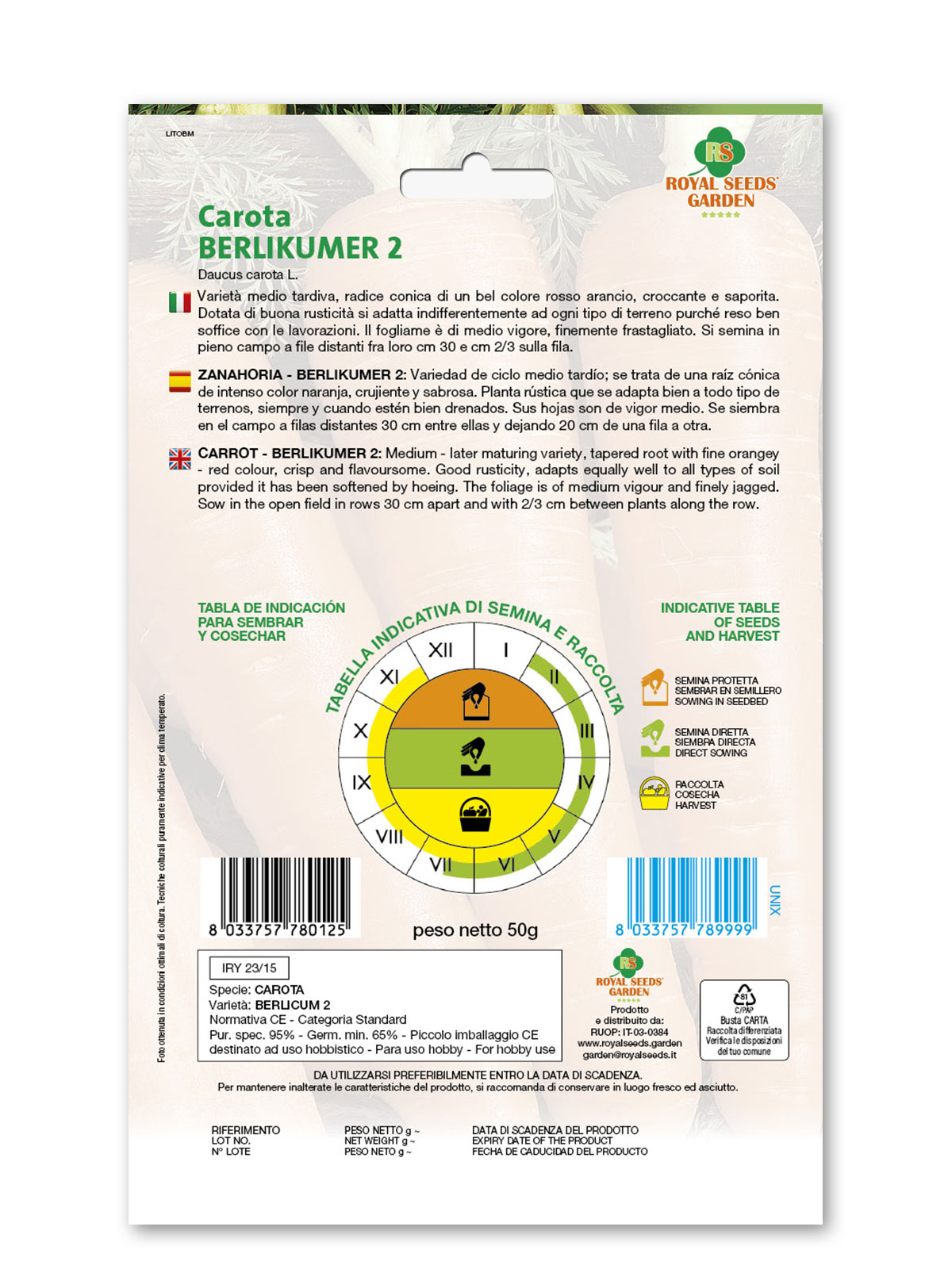 Carota Berlicum 2 – Varietà medio tardiva, radice conica di un bel colore rosso arancio, croccante e saporita. Dotata di buona rusticità si adatta indifferentemente ad ogni tipo di terreno purché reso ben soffice con le lavorazioni. Il fogliame è di medio vigore, finemente frastagliato. Si semina in pieno campo a file distanti fra loro cm 30 e cm 2/3 sulla fila.