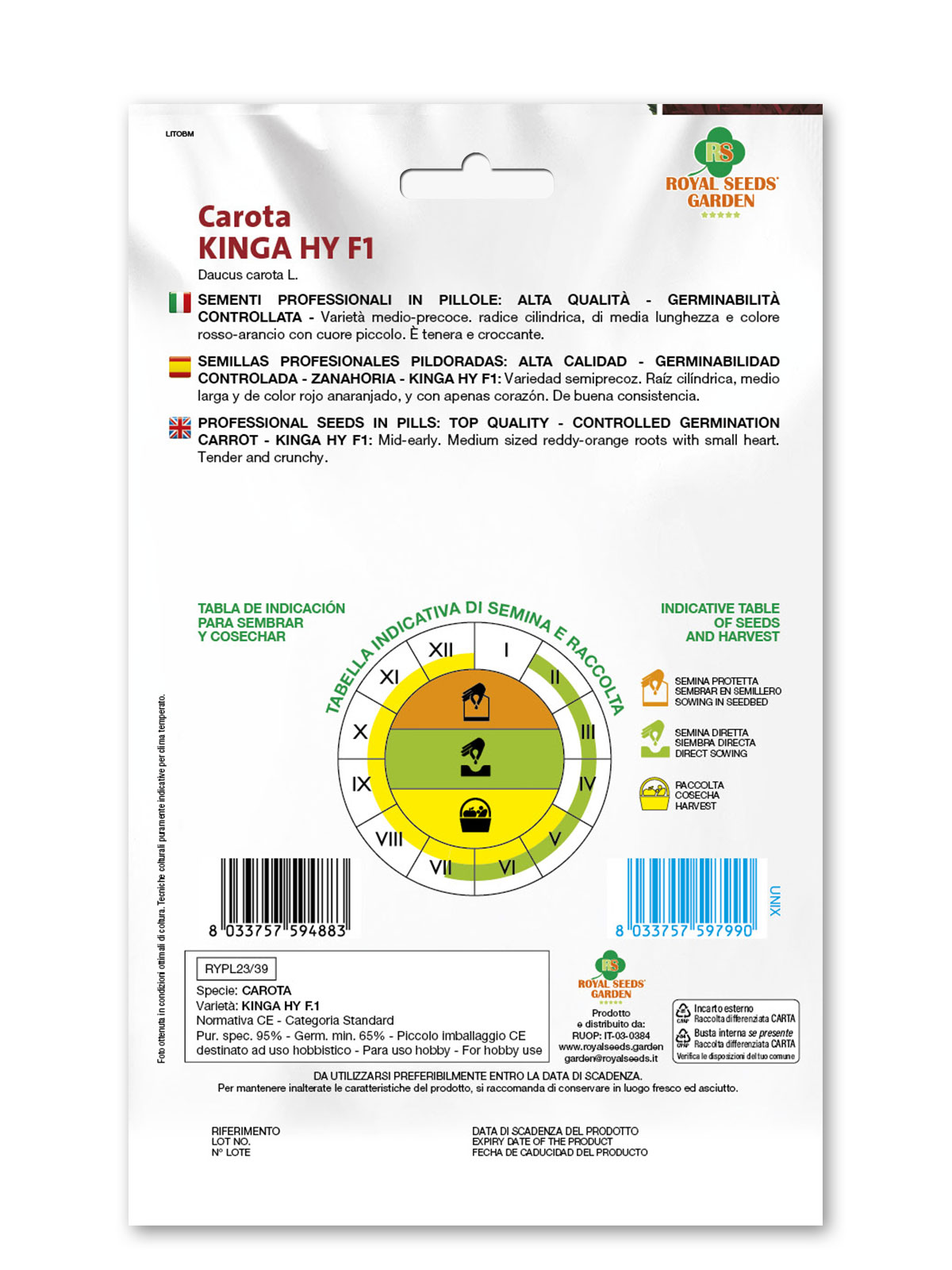 Carrot Kinga HY F1 in pillole – Mid-early. Medium sized reddy-orange roots with small heart. Tender and crunchy.