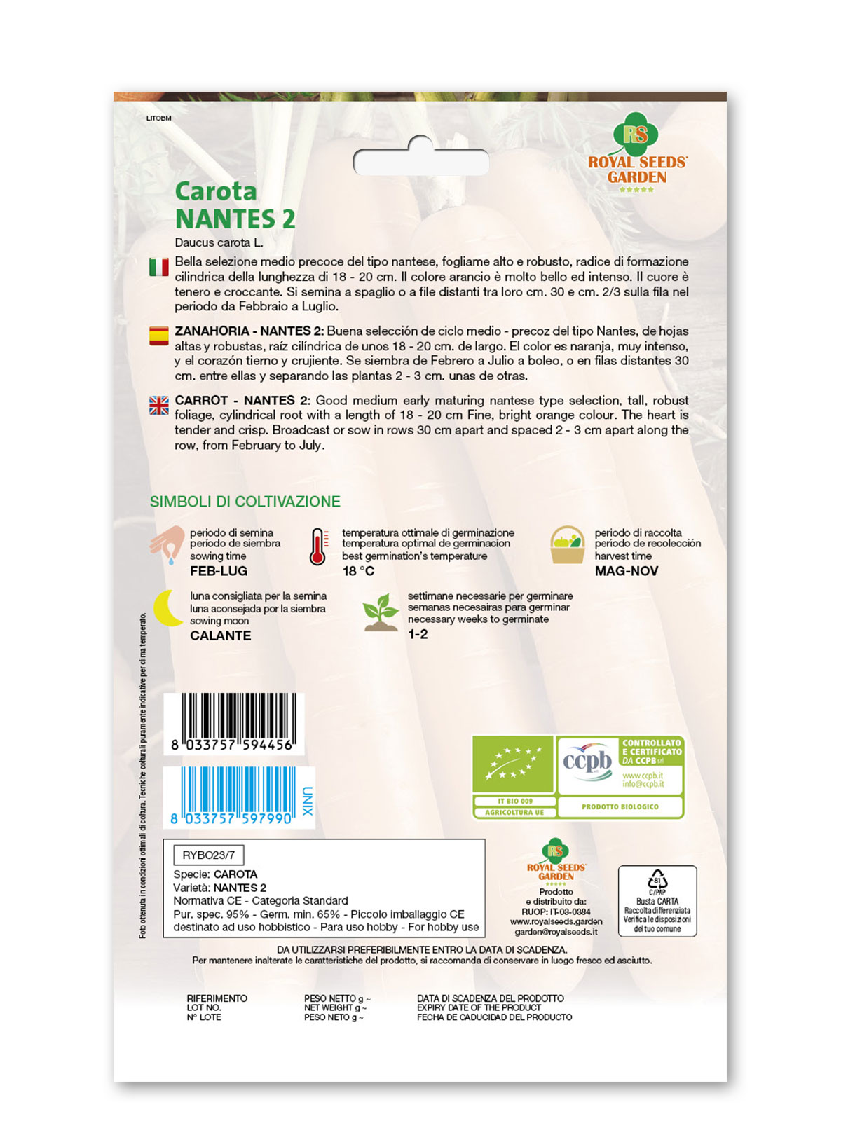 Carota Nantes 2 – Bella selezione medio precoce del tipo nantese, fogliame alto e robusto, radice di formazione cilindrica della lunghezza di 18 – 20 cm. Il colore arancio è molto bello ed intenso. Il cuore è tenero e croccante. Si semina a spaglio o a file distanti tra loro cm. 30 e cm. 2/3 sulla fila nel