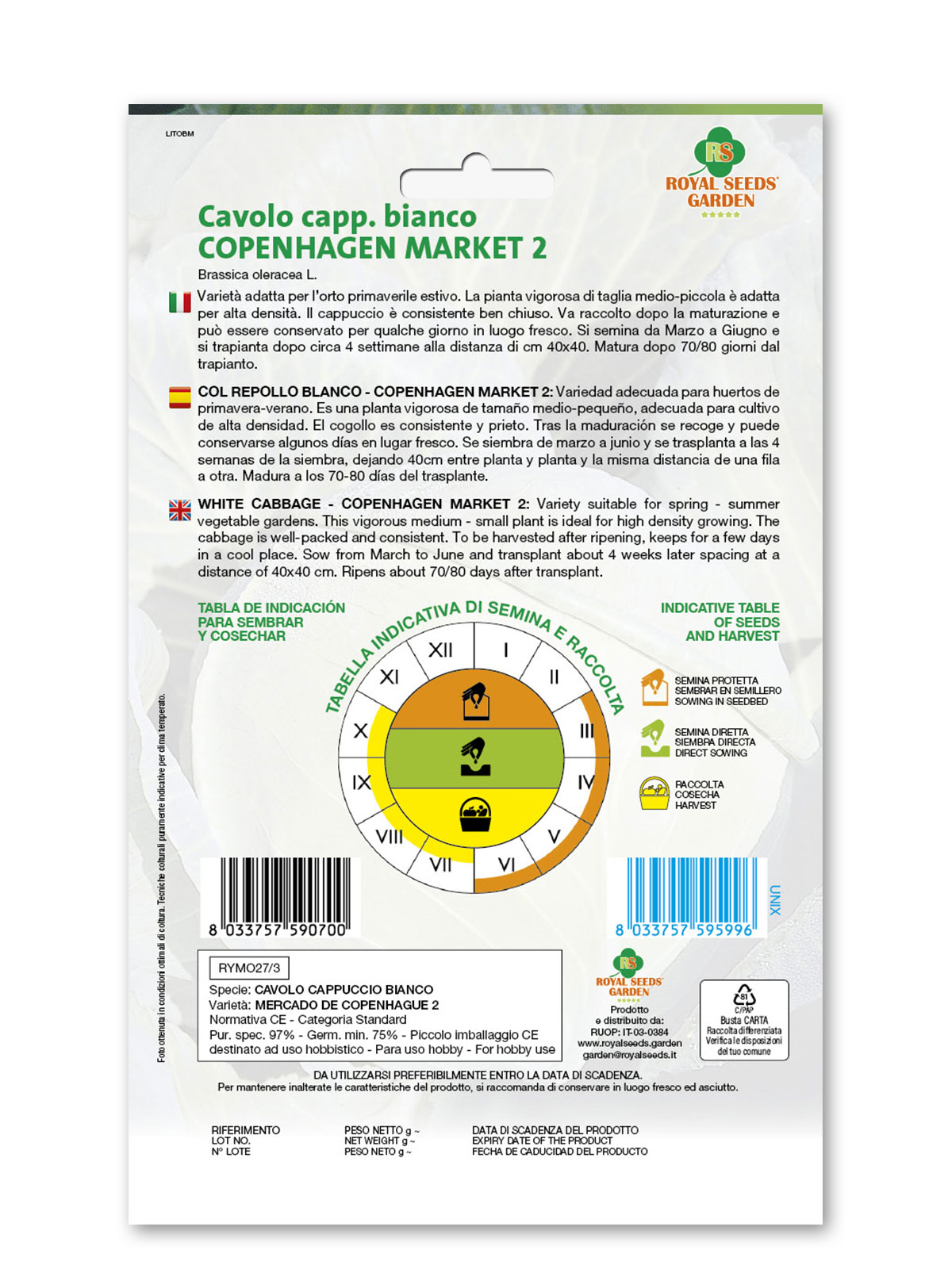 White cabbage Copenhague Market 2 – Variety suitable for spring – summer vegetable gardens. This vigorous medium – small plant is ideal for high density growing. The cabbage is well-packed and consistent. To be harvested after ripening, keeps for a few days in a cool place. Sow from March to June and transplant about 4 weeks later spacing at a distance of 40×40 cm. Ripens about 70/80 days after transplant.