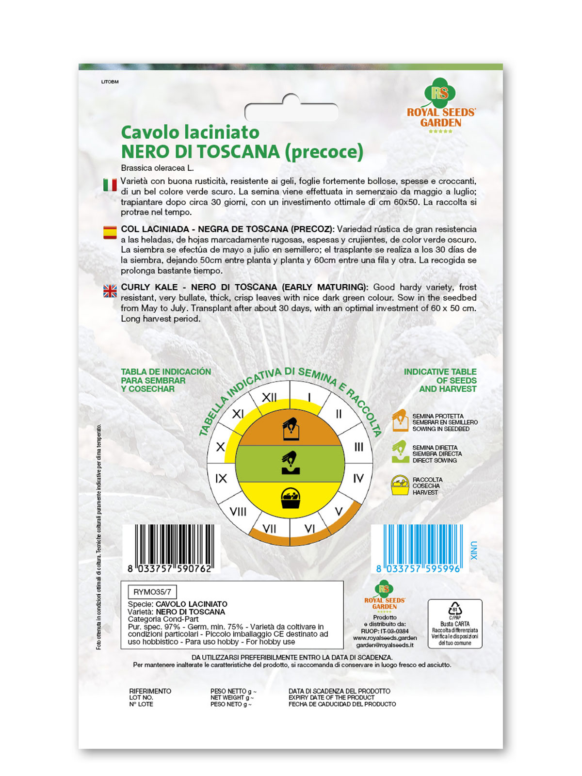Cavolo laciniato Nero di Toscana – Varietà con buona rusticità, resistente ai geli, foglie fortemente bollose, spesse e croccanti, di un bel colore verde scuro. La semina viene effettuata in semenzaio da maggio a luglio; trapiantare dopo circa 30 giorni, con un investimento ottimale di cm 60×50. La raccolta si protrae nel tempo.