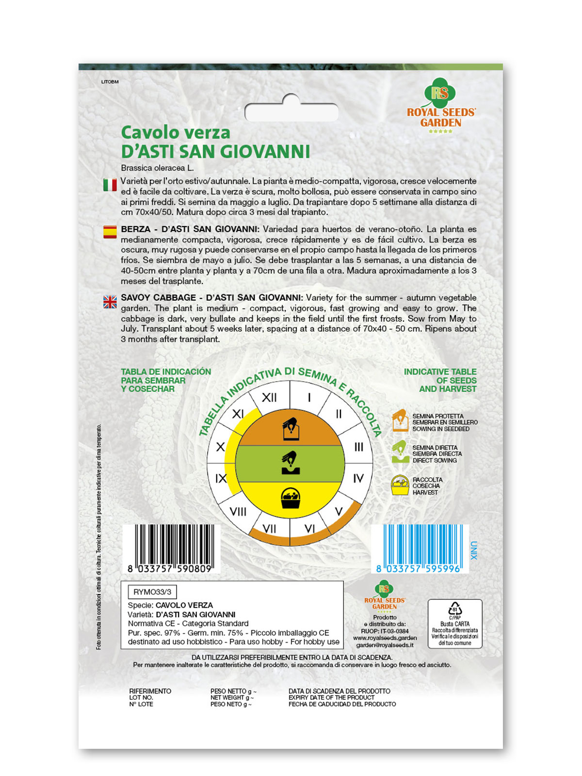 Cavolo verza d’Asti San Giovanni – Varietà per l’orto estivo/autunnale. La pianta è medio-compatta, vigorosa, cresce velocemente ed è facile da coltivare. La verza è scura, molto bollosa, può essere conservata in campo sino ai primi freddi. Si semina da maggio a luglio. Da trapiantare dopo 5 settimane alla distanza di cm 70×40/50. Matura dopo circa 3 mesi dal trapianto.