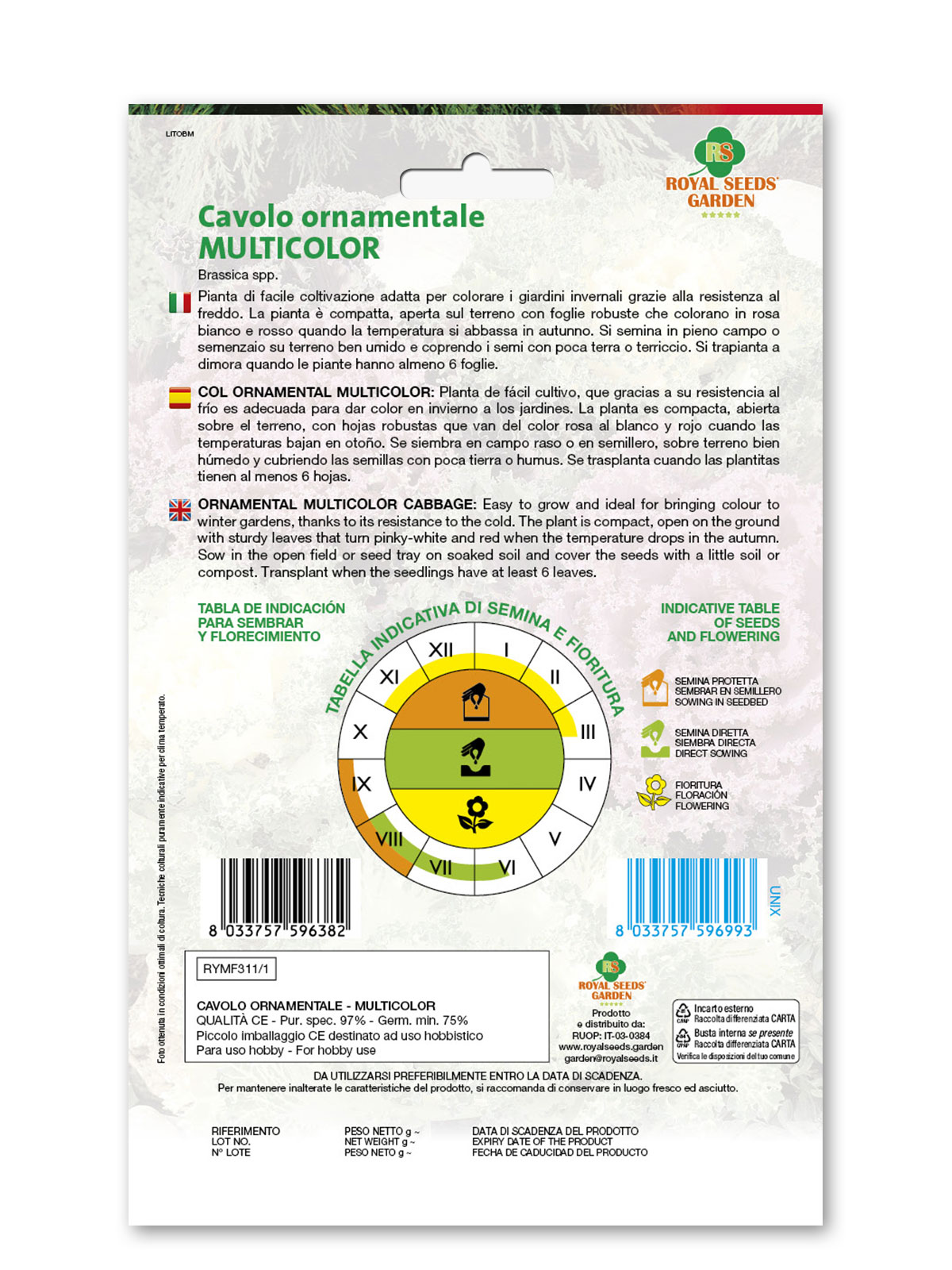 Cavolo ornamentale multicolor – Pianta di facile coltivazione adatta per colorare i giardini invernali grazie alla resistenza al freddo. La pianta è compatta, aperta sul terreno con foglie robuste che colorano in rosa bianco e rosso quando la temperatura si abbassa in autunno. Si semina in pieno campo o semenzaio su terreno ben umido e coprendo i semi con poca terra o terriccio. Si trapianta a dimora quando le piante hanno almeno 6 foglie.