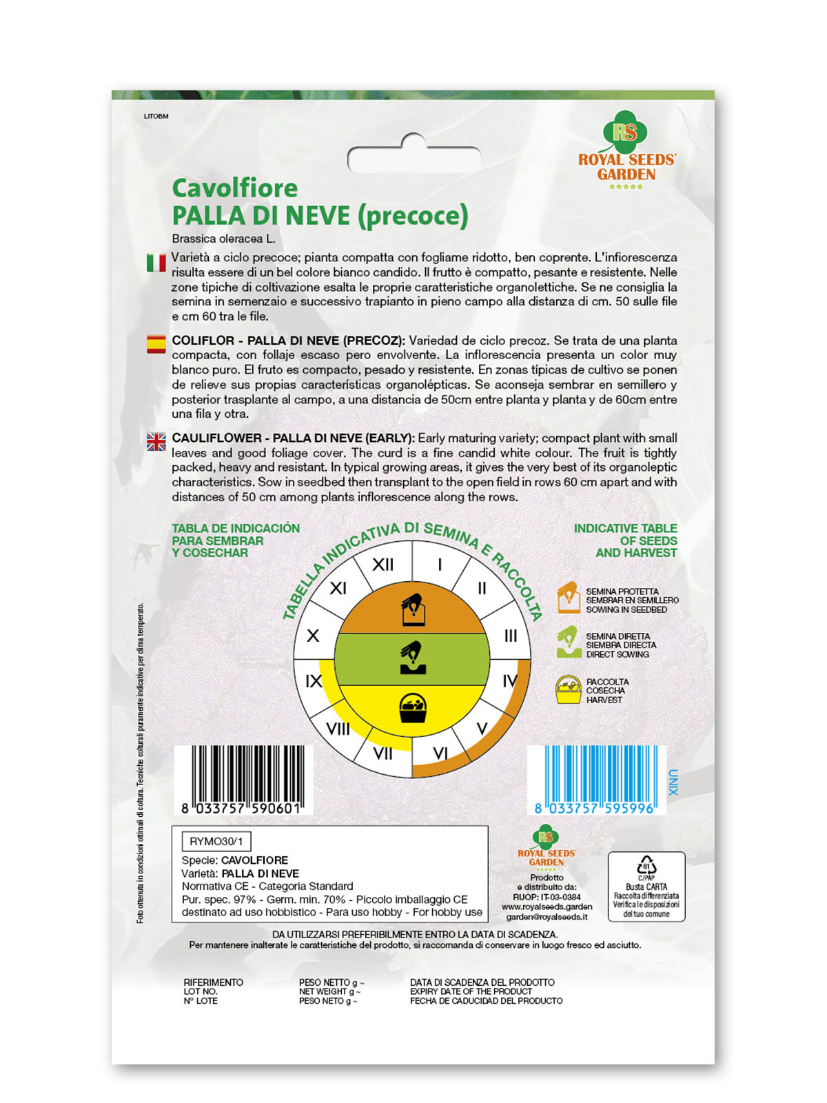 Cavolfiore Palla di neve – Varietà a ciclo precoce; pianta compatta con fogliame ridotto, ben coprente. L’infiorescenza risulta essere di un bel colore bianco candido. Il frutto è compatto, pesante e resistente. Nelle