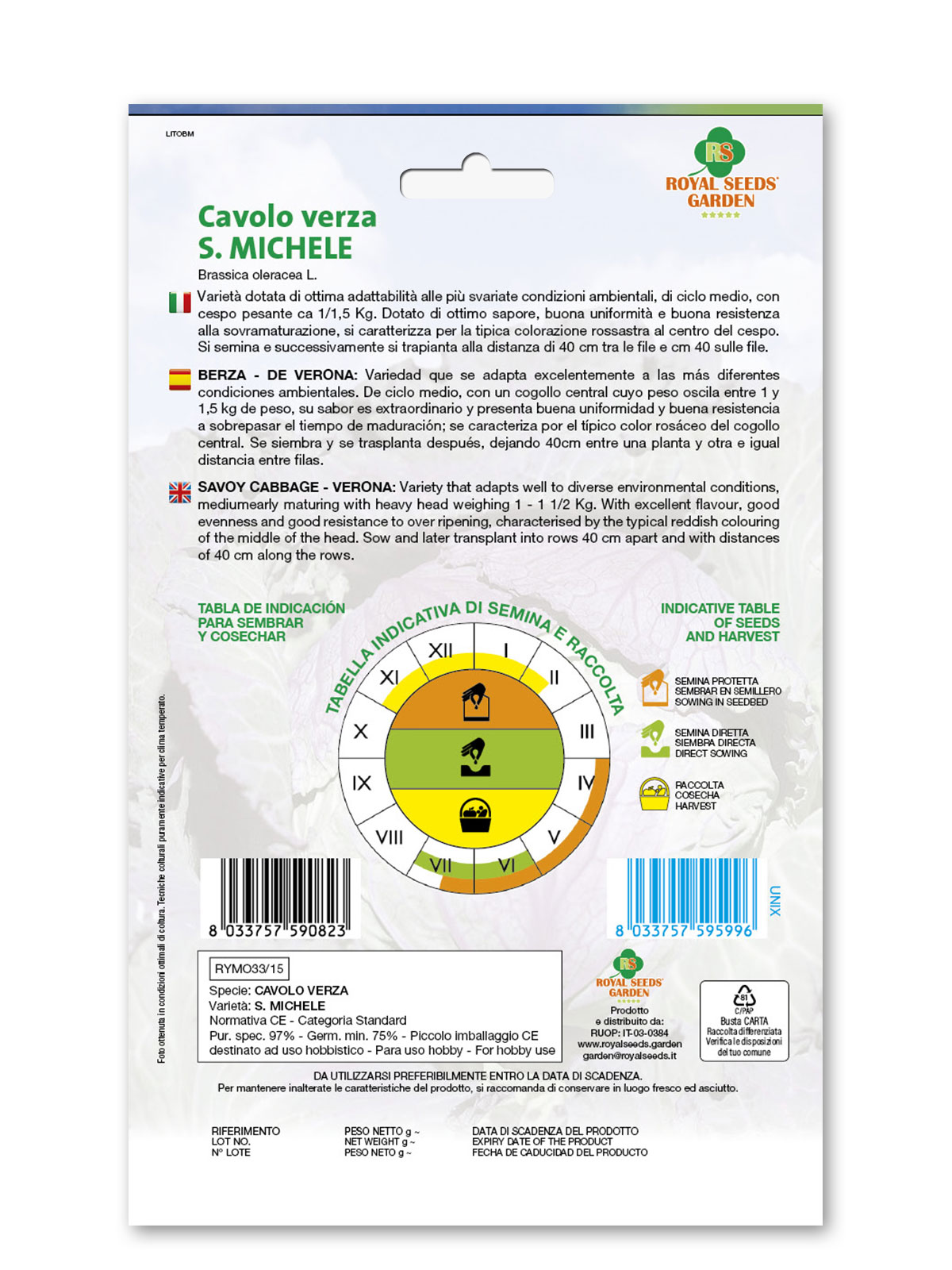 Cavolo verza S. Michele – Varietà dotata di ottima adattabilità alle più svariate condizioni ambientali, di ciclo medio, con cespo pesante ca 1/1,5 Kg. Dotato di ottimo sapore, buona uniformità e buona resistenza alla sovramaturazione, si caratterizza per la tipica colorazione rossastra al centro del cespo. Si semina e successivamente si trapianta alla distanza di 40 cm tra le file e cm 40 sulle file.