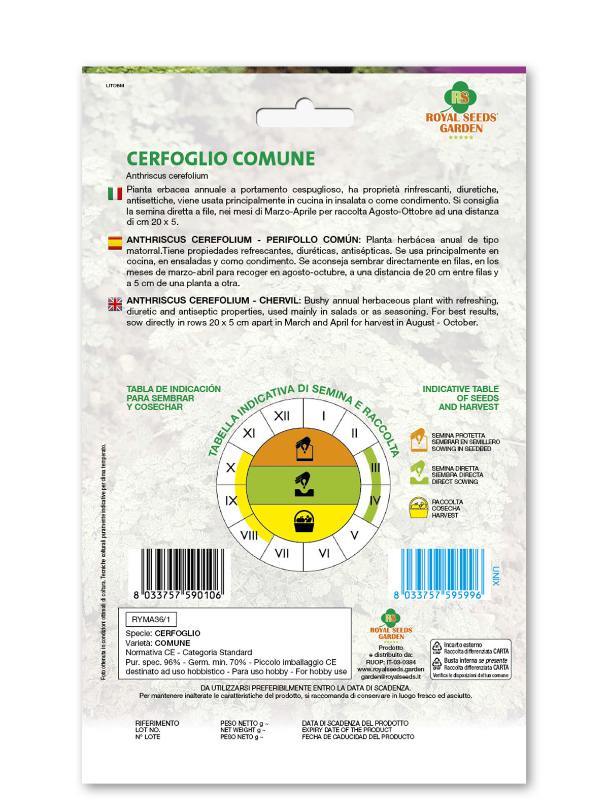 Cerfoglio comune – Pianta erbacea annuale a portamento cespuglioso, ha proprietà rinfrescanti, diuretiche, antisettiche, viene usata principalmente in cucina in insalata o come condimento. Si consiglia la semina diretta a file, nei mesi di Marzo-Aprile per raccolta Agosto-Ottobre ad una distanza di cm 20 x 5.