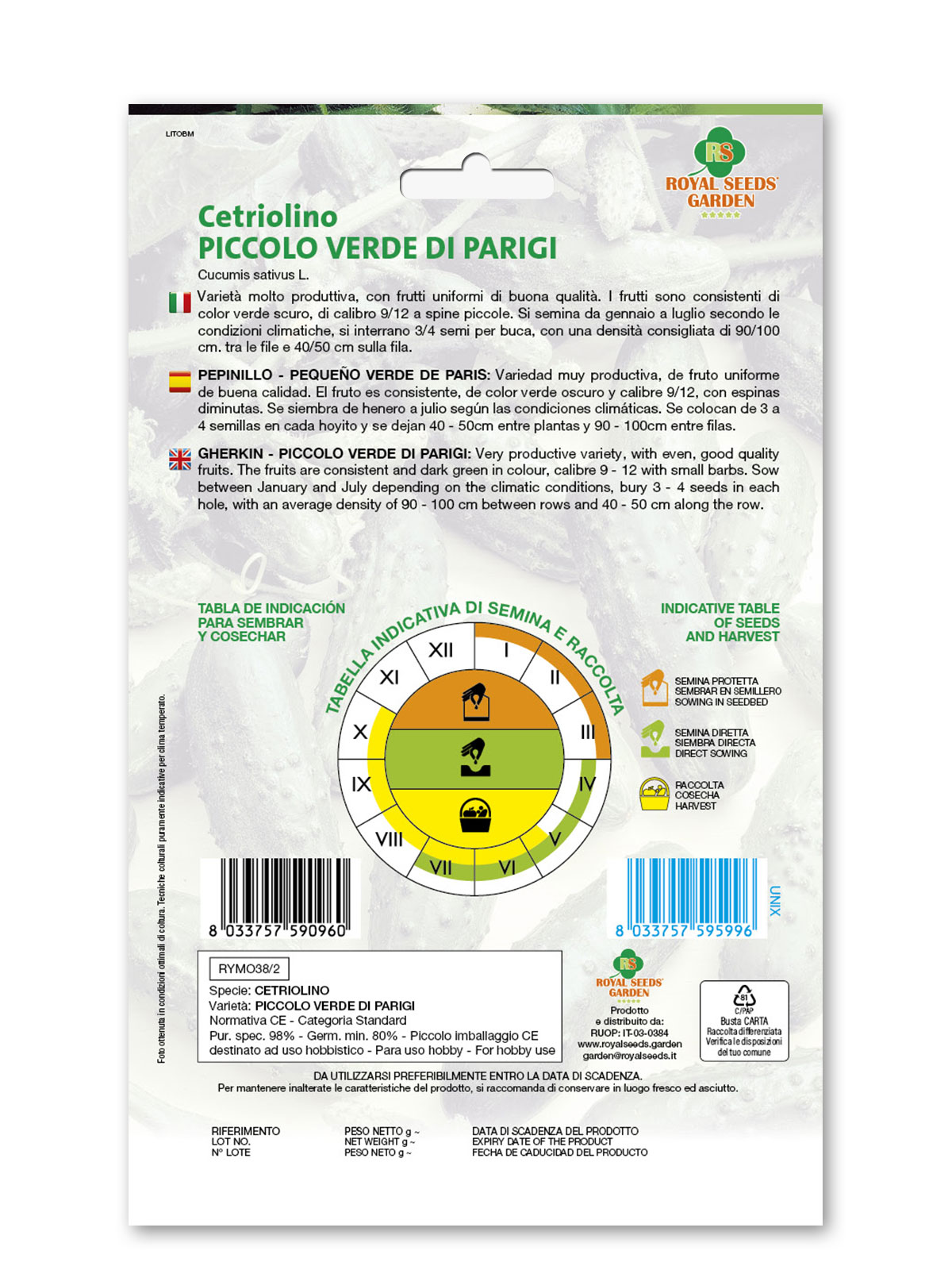 Cetriolino Piccolo verde di Parigi – Varietà molto produttiva, con frutti uniformi di buona qualità. I frutti sono consistenti di color verde scuro, di calibro 9/12 a spine piccole. Si semina da gennaio a luglio secondo le condizioni climatiche, si interrano 3/4 semi per buca, con una densità consigliata di 90/100 cm. tra le file e 40/50 cm sulla fila.