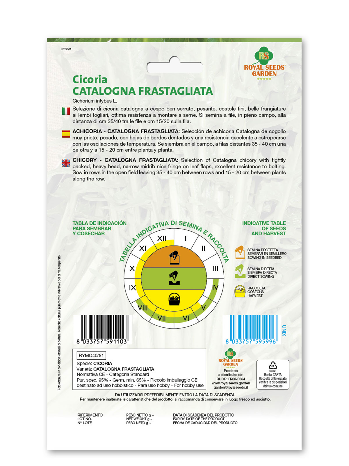 Cicoria catalogna frastagliata – Selezione di cicoria catalogna a cespo ben serrato, pesante, costole fini, belle frangiature ai lembi fogliari, ottima resistenza a montare a seme. Si semina a file, in pieno campo, alla distanza di cm 35/40 tra le file e cm 15/20 sulla fila.