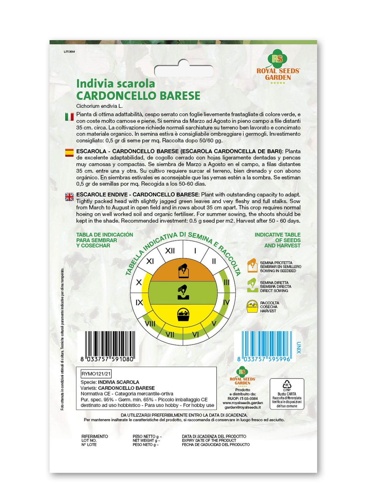 Indivia scarola Cardoncello barese – Pianta di ottima adattabilità, cespo serrato con foglie lievemente frastagliate di colore verde, e con coste molto carnose e piene. Si semina da Marzo ad Agosto in pieno campo a file distanti 35 cm. circa. La coltivazione richiede normali sarchiature su terreno ben lavorato e concimato con materiale organico. In semina estiva è consigliabile ombreggiare i germogli. Investimento consigliato: 0,5 gr di seme per mq. Raccolta dopo 50/60 gg.