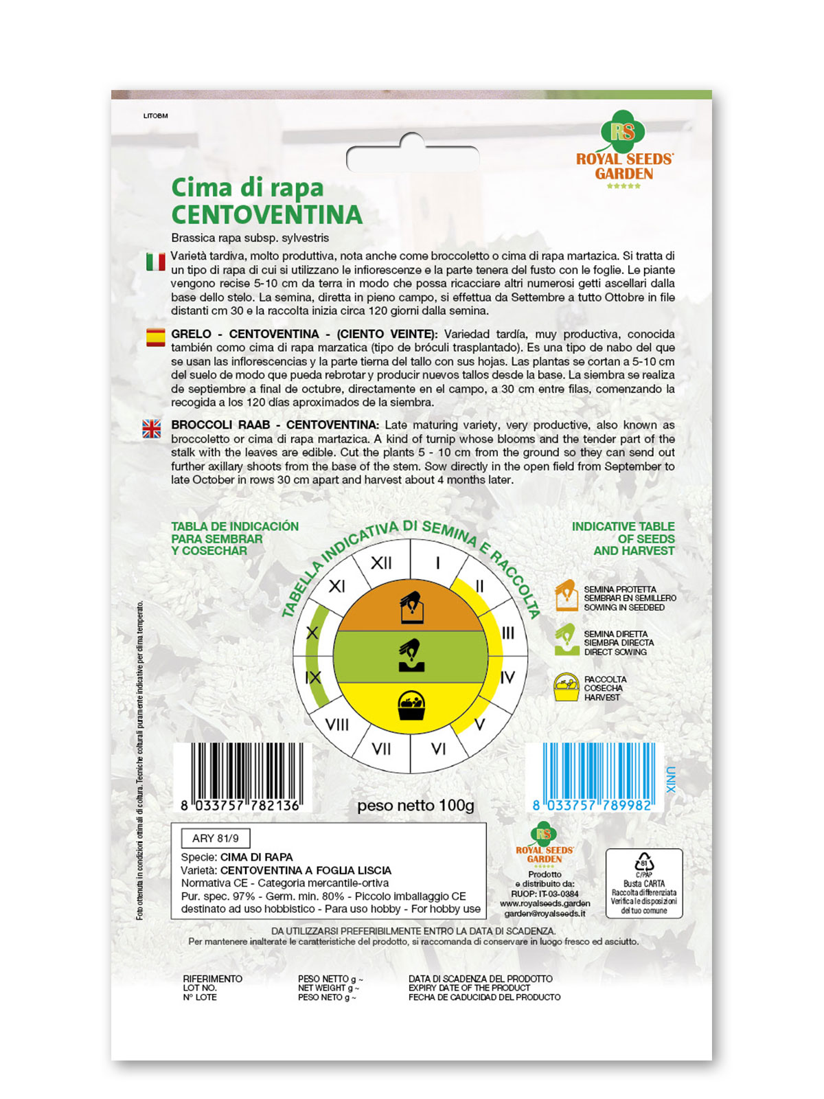 Cima di rapa centoventina – Varietà tardiva, molto produttiva, nota anche come broccoletto o cima di rapa martazica. Si tratta di un tipo di rapa di cui si utilizzano le infiorescenze e la parte tenera del fusto con le foglie. Le piante vengono recise 5-10 cm da terra in modo che possa ricacciare altri numerosi getti ascellari dalla base dello stelo. La semina, diretta in pieno campo, si effettua da Settembre a tutto Ottobre in file distanti cm 30 e la raccolta inizia circa 120 giorni dalla semina.
