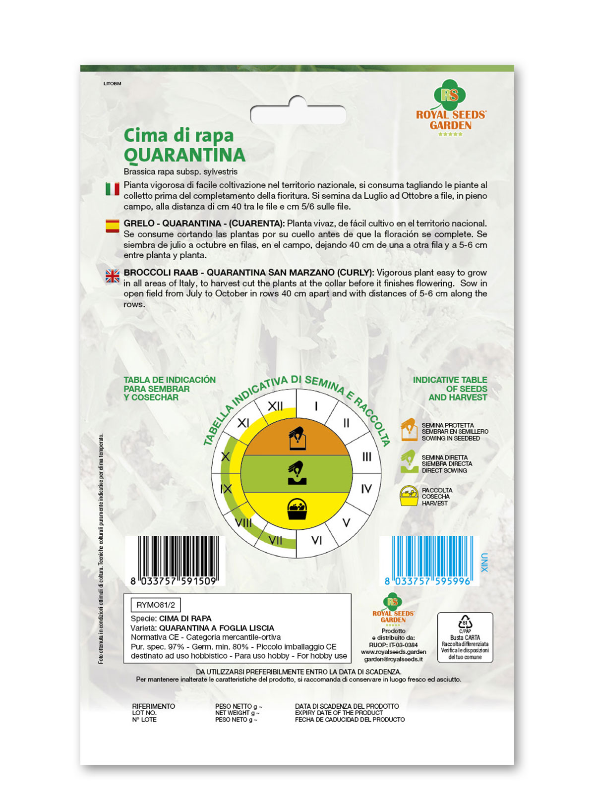 Cima di rapa quarantina – Pianta vigorosa di facile coltivazione nel territorio nazionale, si consuma tagliando le piante al colletto prima del completamento della fioritura. Si semina da Luglio ad Ottobre a file, in pieno campo, alla distanza di cm 40 tra le file e cm 5/6 sulle file.