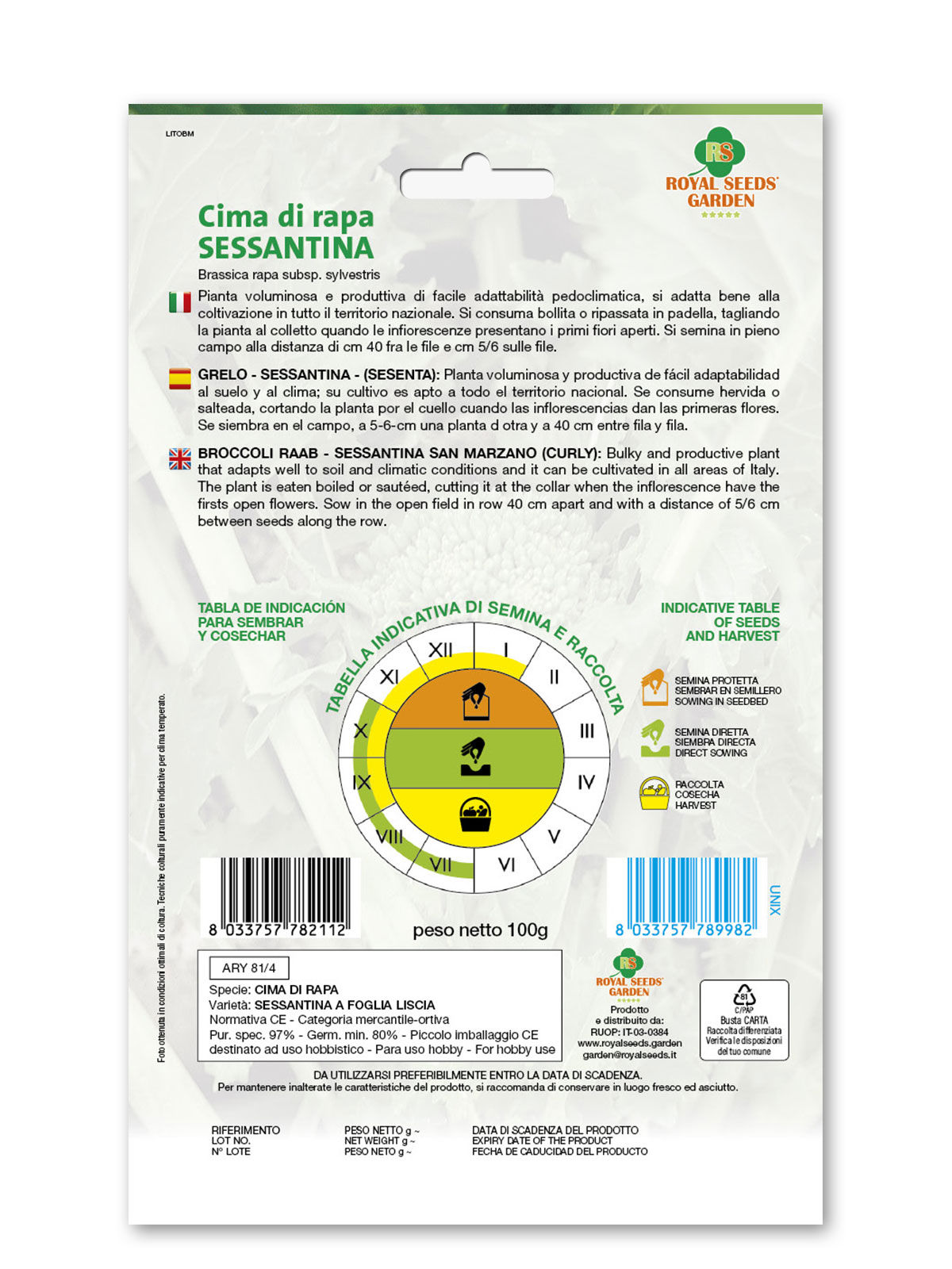 Cima di rapa sessantina – Pianta voluminosa e produttiva di facile adattabilità pedoclimatica, si adatta bene alla coltivazione in tutto il territorio nazionale. Si consuma bollita o ripassata in padella, tagliando la pianta al colletto quando le infiorescenze presentano i primi fiori aperti. Si semina in pieno campo alla distanza di cm 40 fra le file e cm 5/6 sulle file.