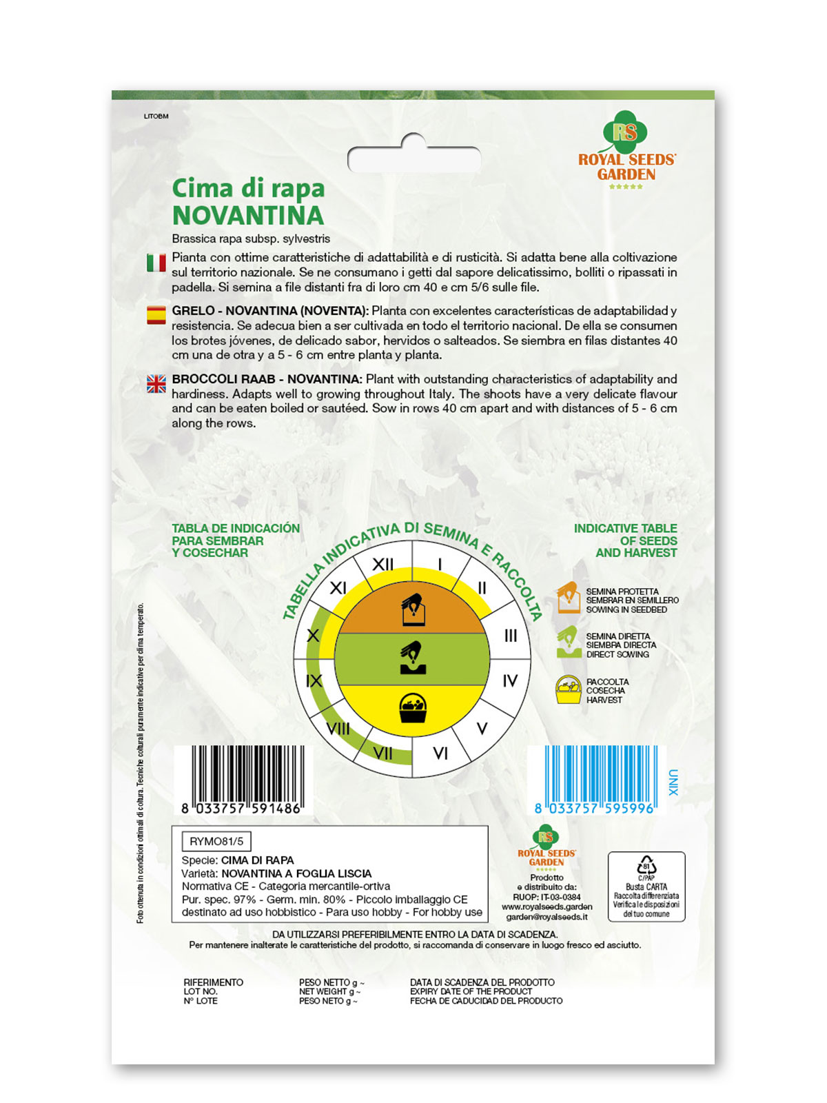 Cima di rapa novantina – Pianta con ottime caratteristiche di adattabilità e di rusticità. Si adatta bene alla coltivazione sul territorio nazionale. Se ne consumano i getti dal sapore delicatissimo, bolliti o ripassati in padella. Si semina a file distanti fra di loro cm 40 e cm 5/6 sulle file.