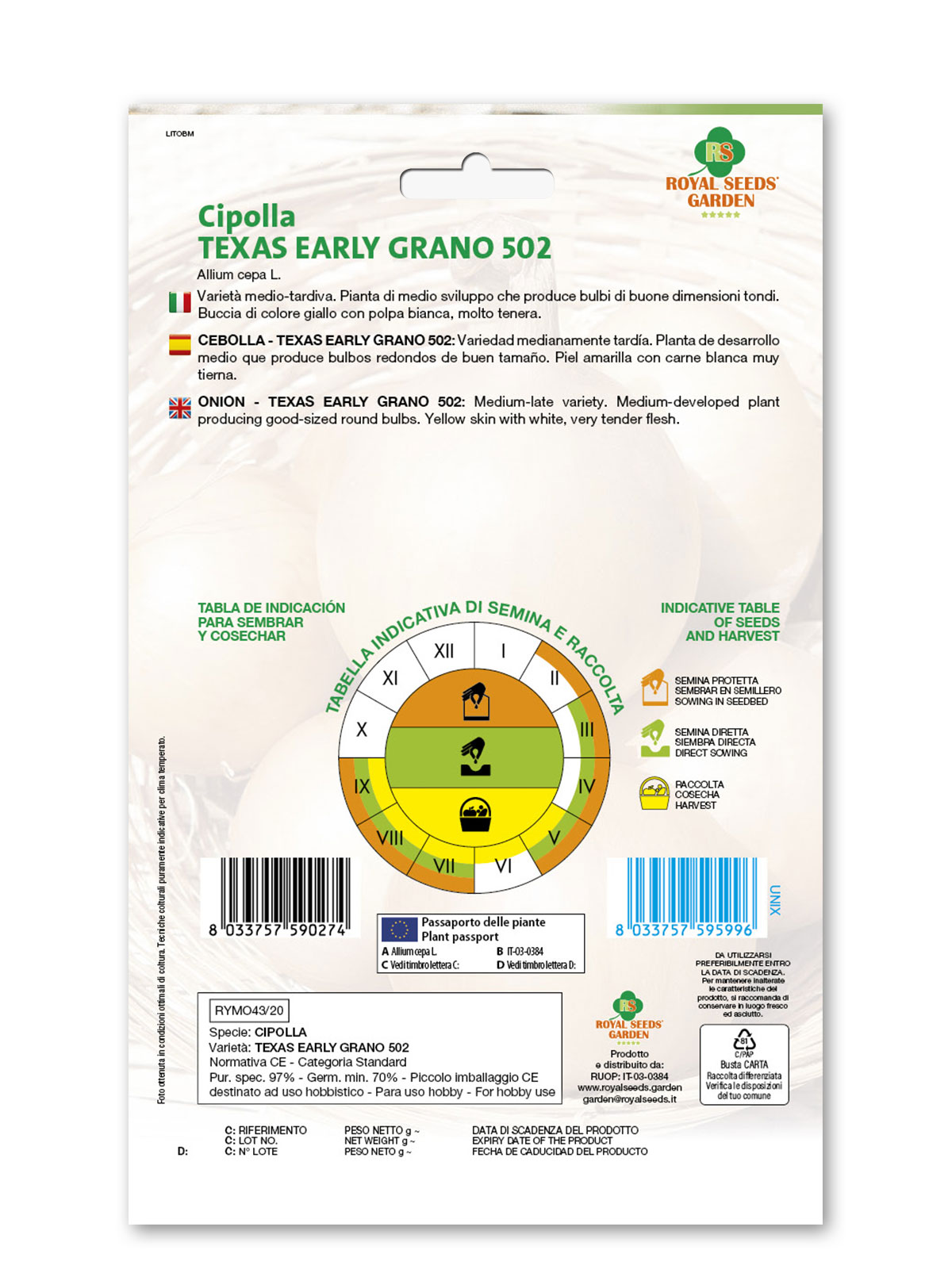 Cipolla Texas early grano 502 – Varietà medio-tardiva. Pianta di medio sviluppo che produce bulbi di buone dimensioni tondi. Buccia di colore giallo con polpa bianca, molto tenera.