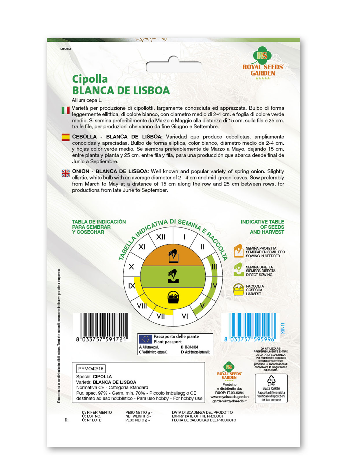 Cipolla blanca de lisboa – Varietà per produzione di cipollotti, largamente conosciuta ed apprezzata. Bulbo di forma leggermente ellittica, di colore bianco, con diametro medio di 2-4 cm. e foglia di colore verde medio. Si semina preferibilmente da Marzo a Maggio alla distanza di 15 cm. sulla fila e 25 cm. tra le file, per produzioni che vanno da fine Giugno e Settembre.