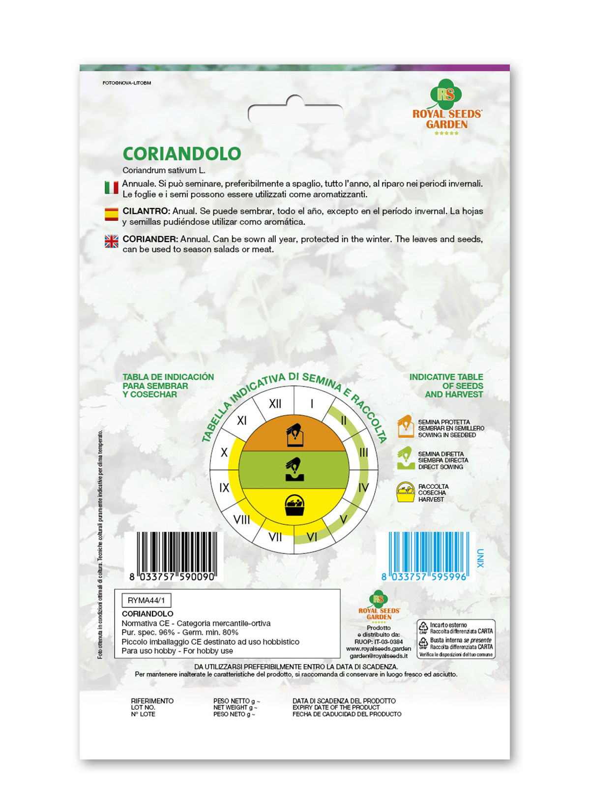 Coriandolo – Annuale. Si può seminare, preferibilmente a spaglio, tutto l’anno, al riparo nei periodi invernali. Le foglie e i semi possono essere utilizzati come aromatizzanti.
