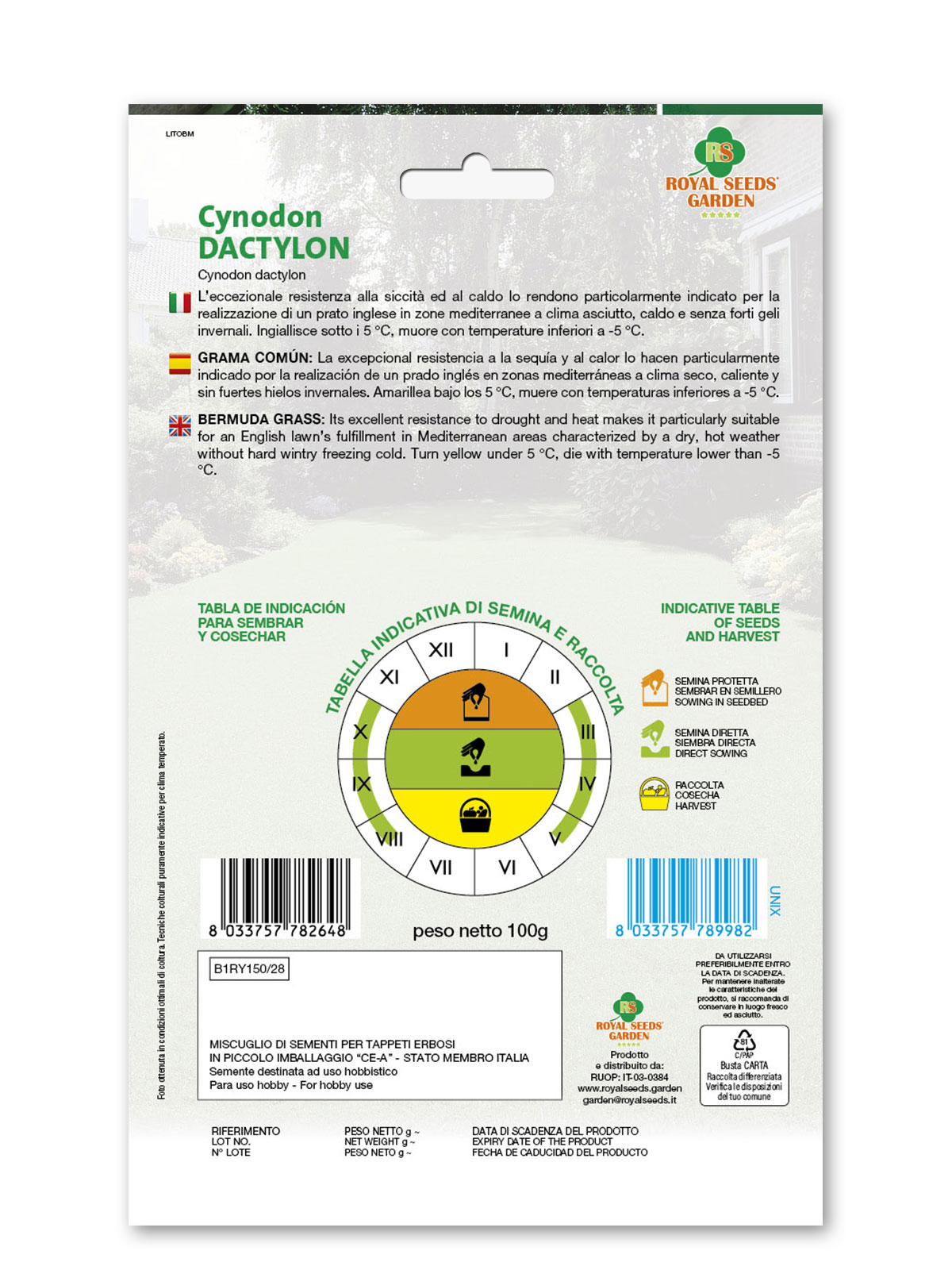 Cynodon dactylon – (Gramigna) – Miscuglio di gramigna indicato per climi aridi composto da diverse varietà di cynodon dactylon. Adatto a terreni siccitosi ed a temperature elevate. Ha una discreta resistenza al calpestio e buona velocità di sviluppo. Seme confettato per una migliore germinazione. Non necessita di particolari manutenzioni ma solo di normali concimazioni e moderate annaffiature.