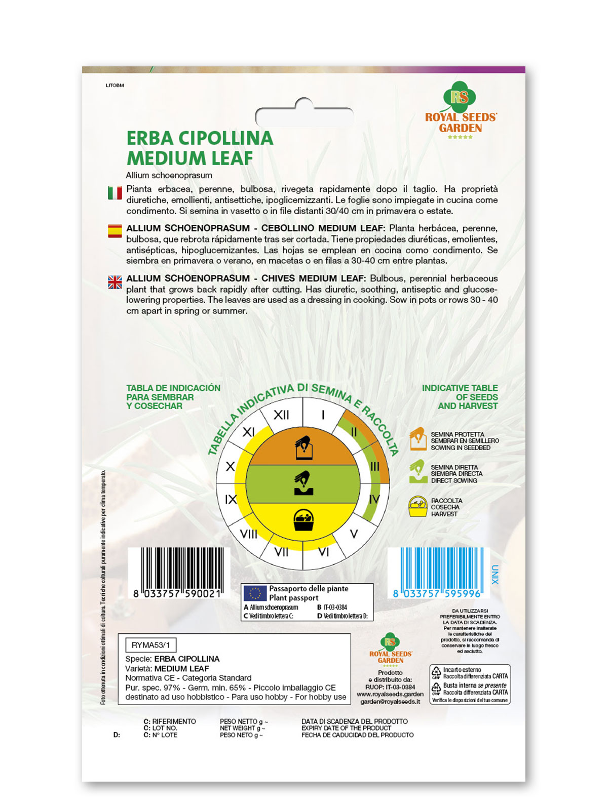 Erba cipollina medium leaf – Varietà precoce. Pianta annuale con foglie filiformi allungate, di colore verde e sapore intenso. Si utilizzano le foglie fresche, per aromatizzare piatti.