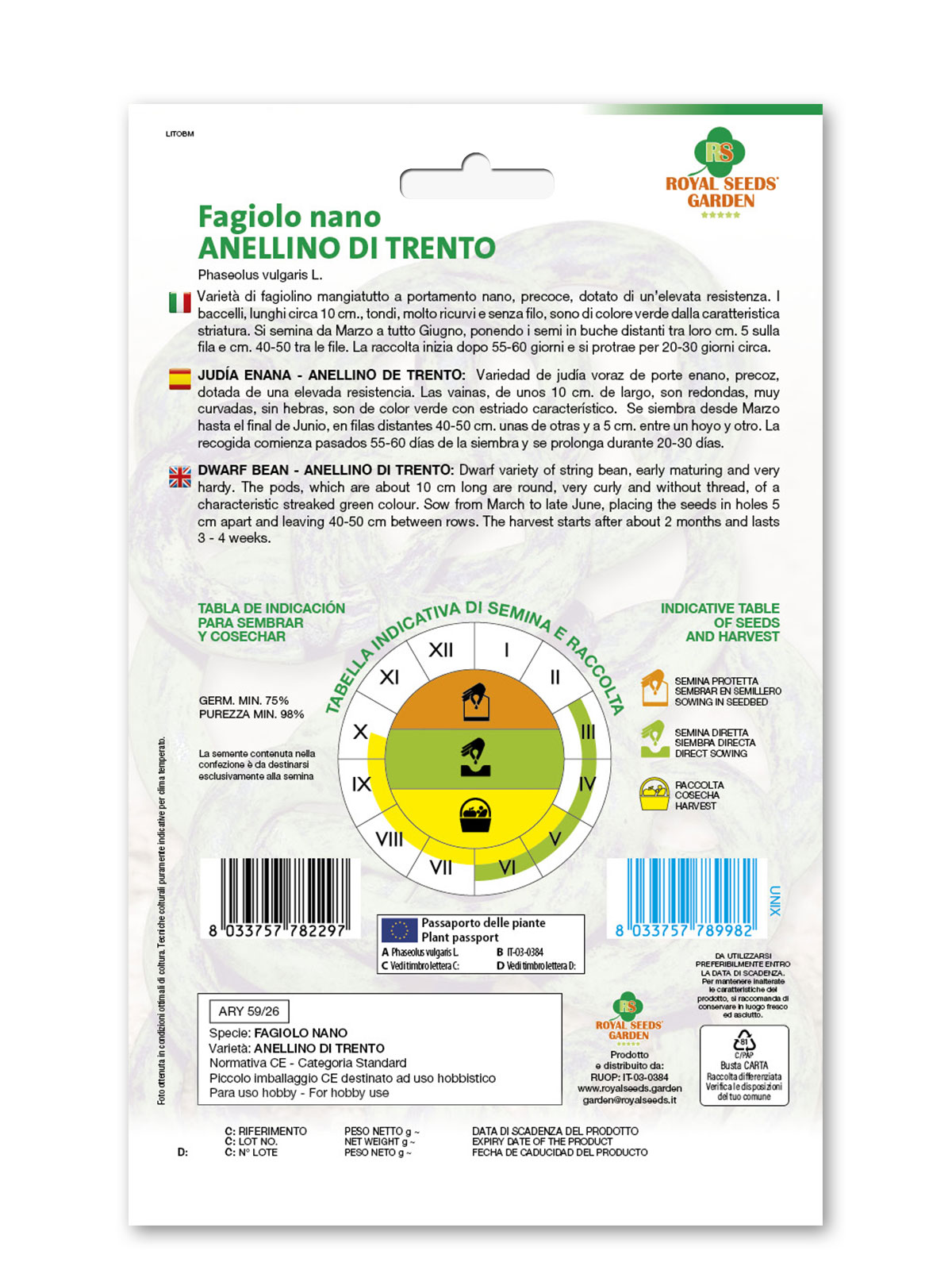 Fagiolo nano Anellino di Trento – Varietà di fagiolino mangiatutto a portamento nano, precoce, dotato di un’elevata resistenza. I baccelli, lunghi circa 10 cm., tondi, molto ricurvi e senza filo, sono di colore verde dalla caratteristica striatura. Si semina da Marzo a tutto Giugno, ponendo i semi in buche distanti tra loro cm. 5 sulla fila e cm. 40-50 tra le file. La raccolta inizia dopo 55-60 giorni e si protrae per 20-30 giorni circa.