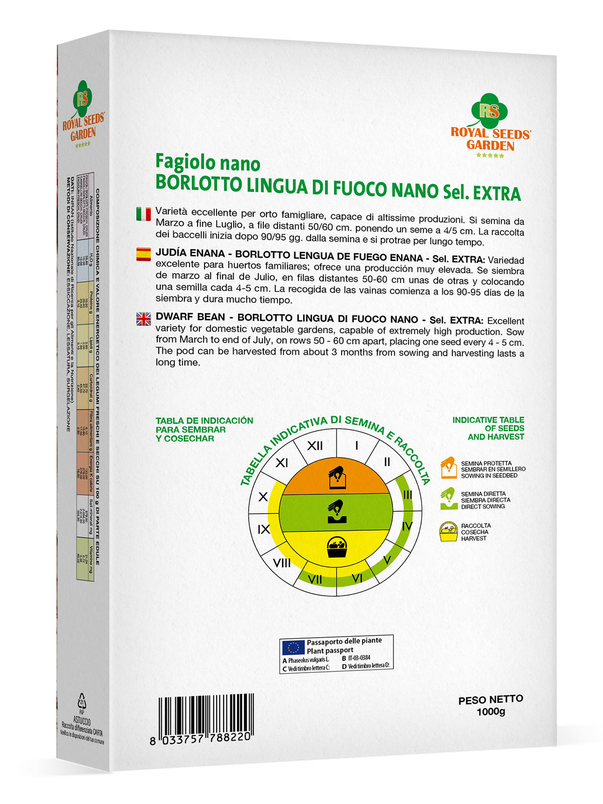 Fagiolo nano Borlotto lingua di fuoco sel. Extra – Varietà eccellente per orto famigliare, capace di altissime produzioni. Si semina da Marzo a fine Luglio, a file distanti 50/60 cm. ponendo un seme a 4/5 cm. La raccolta dei baccelli inizia dopo 90/95 gg. dalla semina e si protrae per lungo tempo.