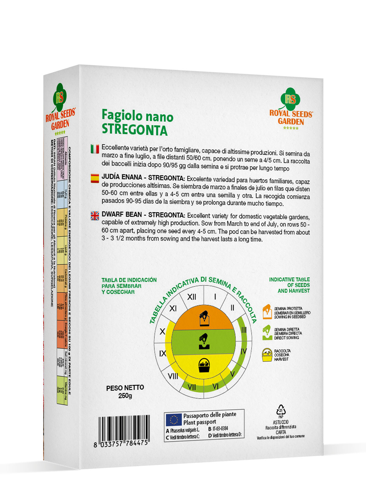 Fagiolo nano Stregonta – Eccellente varietà per l’orto famigliare, capace di altissime produzioni. Si semina da marzo a fine luglio, a file distanti 50/60 cm. ponendo un seme a 4/5 cm. La raccolta dei baccelli inizia dopo 90/95 gg dalla semina e si protrae per lungo tempo