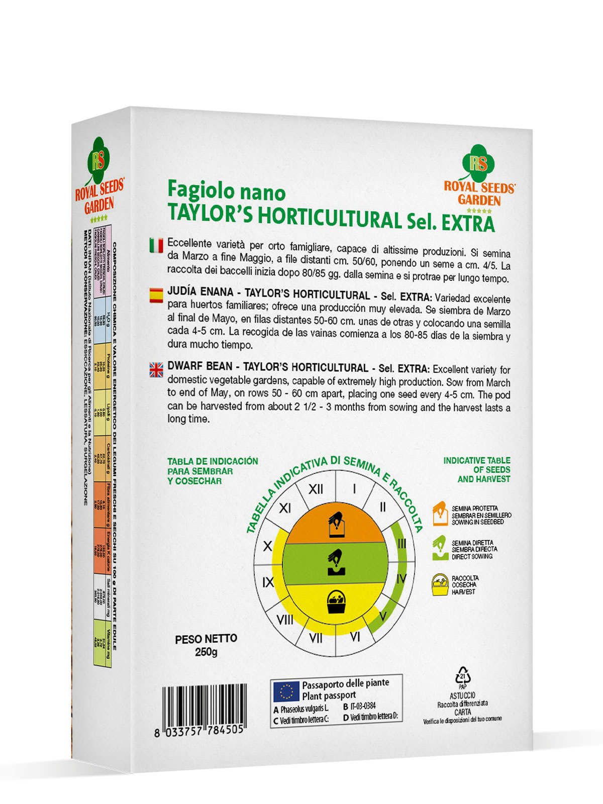 Dwarf bean Taylor’s horticultural sel. Extra – Excellent variety for domestic vegetable gardens, capable of extremely high production. Sow from March to end of May, on rows 50 – 60 cm apart, placing one seed every 4-5 cm. The pod can be harvested from about 2 1/2 – 3 months from sowing and the harvest lasts a long time.