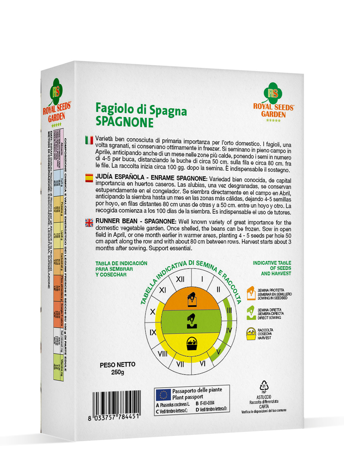 Fagiolo di Spagna Spagnone – Varietà ben conosciuta di primaria importanza per l’orto domestico. I fagioli, una volta sgranati, si conservano ottimamente in freezer. Si seminano in pieno campo in Aprile, anticipando anche di un mese nelle zone più calde, ponendo i semi in numero di 4-5 per buca, distanziando le buche di circa 50 cm. sulla fila e circa 80 cm. fra le file. La raccolta inizia circa 100 gg. dopo la semina. È indispensabile il sostegno.