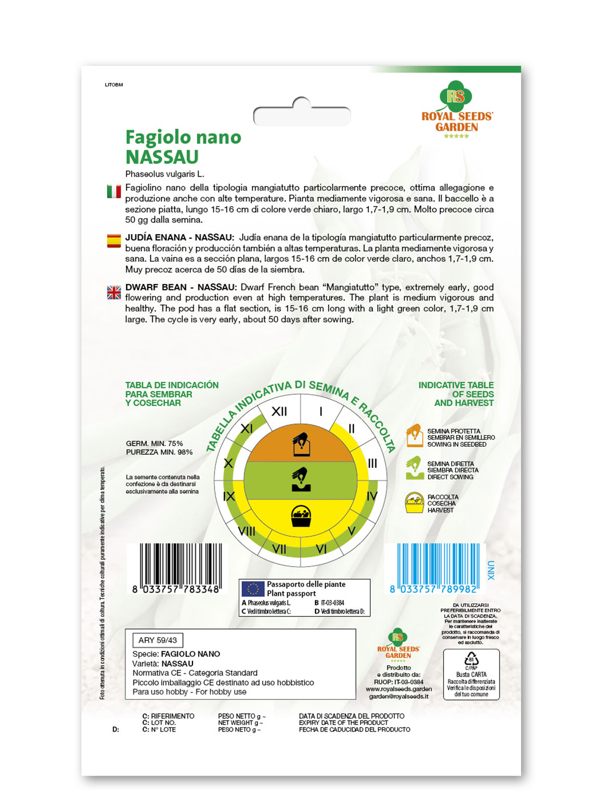 Fagiolo nano Nassau – Fagiolino nano della tipologia mangiatutto particolarmente precoce, ottima allegagione e produzione anche con alte temperature. Pianta mediamente vigorosa e sana. Il baccello è a sezione piatta, lungo 15-16 cm di colore verde chiaro, largo 1,7-1,9 cm. Molto precoce circa 50 gg dalla semina.