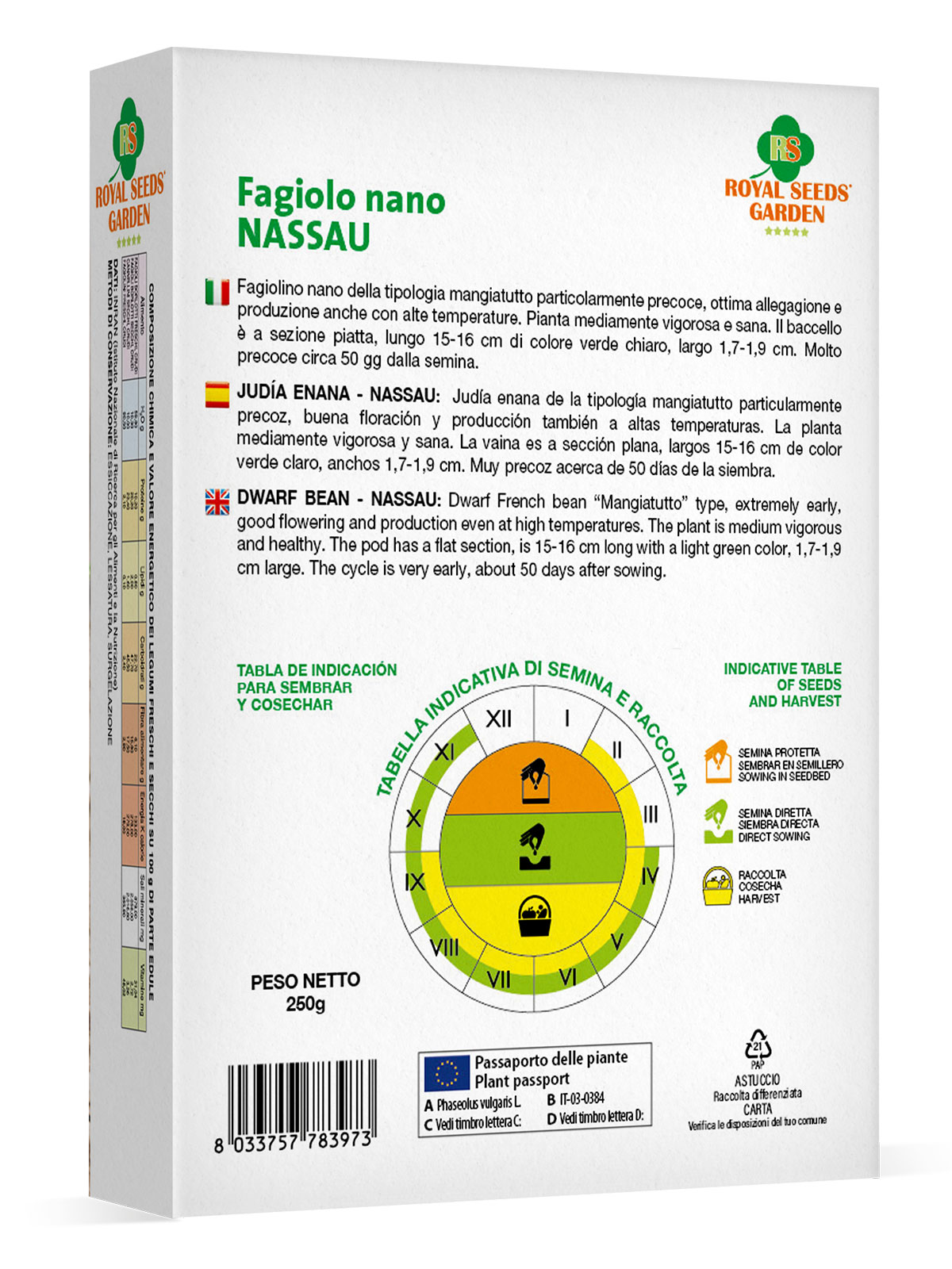 Fagiolo nano Nassau – Fagiolino nano della tipologia mangiatutto particolarmente precoce, ottima allegagione e produzione anche con alte temperature. Pianta mediamente vigorosa e sana. Il baccello è a sezione piatta, lungo 15-16 cm di colore verde chiaro, largo 1,7-1,9 cm. Molto precoce circa 50 gg dalla semina.