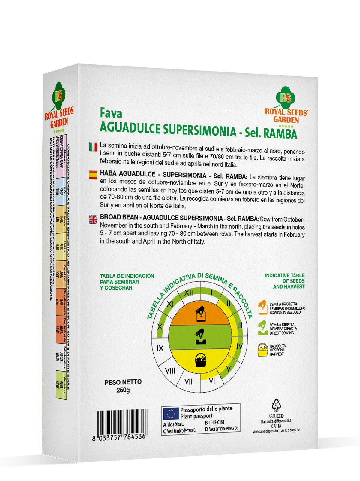 Fava Aguadulce Supersimonia sel. Ramba – La semina inizia ad ottobre-novembre al sud e a febbraio-marzo al nord, ponendo i semi in buche distanti 5/7 cm sulle file e 70/80 cm tra le file. La raccolta inizia a febbraio nelle regioni del sud e ad aprile nel nord Italia.