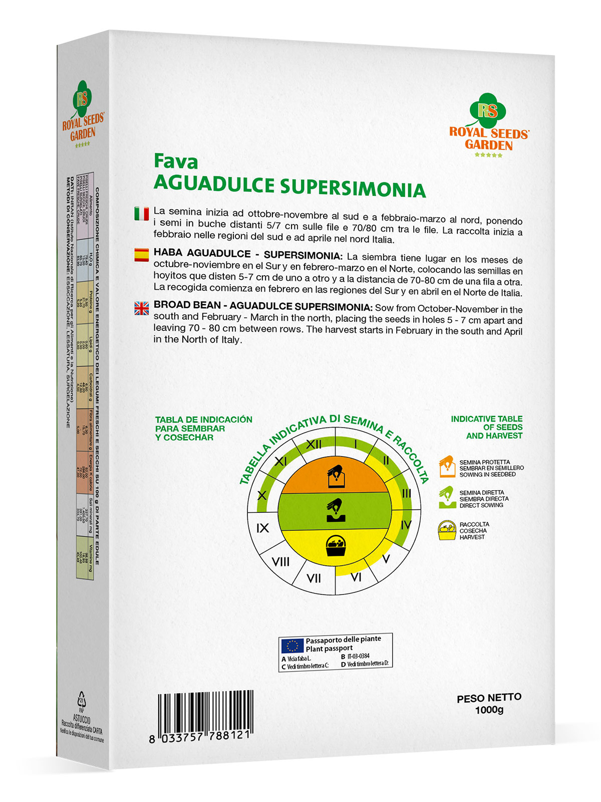Fava Aguadulce Supersimonia – La semina inizia ad ottobre-novembre al sud e a febbraio-marzo al nord, ponendo i semi in buche distanti 5/7 cm sulle file e 70/80 cm tra le file. La raccolta inizia a febbraio nelle regioni del sud e ad aprile nel nord Italia.