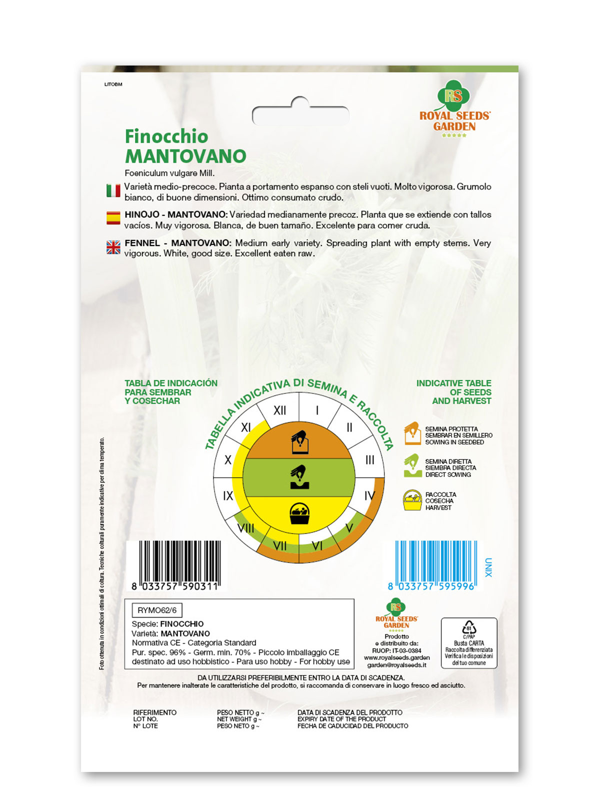 Finocchio Mantovano – Varietà medio-precoce. Pianta a portamento espanso con steli vuoti. Molto vigorosa. Grumolo bianco, di buone dimensioni. Ottimo consumato crudo.
