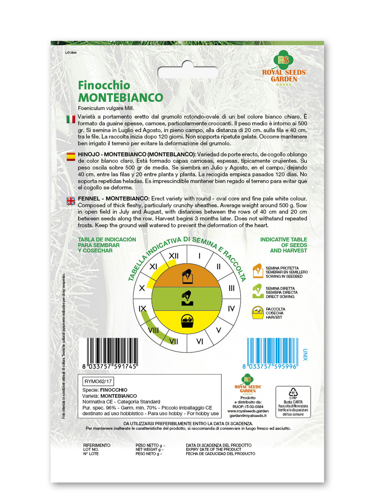 Finocchio Montebianco – Varietà con ampia adattabilità alla diverse condizioni ambientali, idoneo per l’impiego domestico ed industriale. Si semina in pieno campo, trapiantando la radice ottenuta, l’anno successivo alla semina. Si può inoltre seminare in vasetto trapiantando le piantine 3 mesi dopo la semina. In campo va distanziato a m 1 x 0,40. La raccolta inizia il 2° anno dal trapianto.
