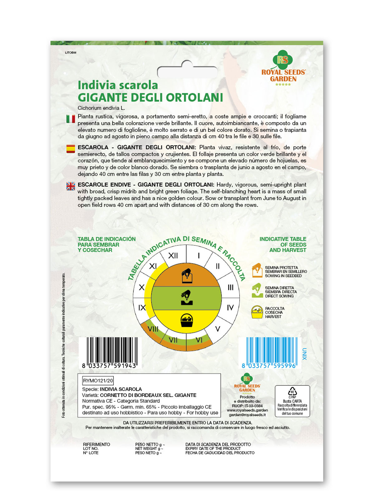 Indivia scarola gigante degli ortolani – Pianta rustica, vigorosa, a portamento semi-eretto, a coste ampie e croccanti; il fogliame presenta una bella colorazione verde brillante. Il cuore, autoimbiancante, è composto da un elevato numero di foglioline, è molto serrato e di un bel colore dorato. Si semina o trapianta da giugno ad agosto in pieno campo alla distanza di cm 40 tra le file e 30 sulle file.
