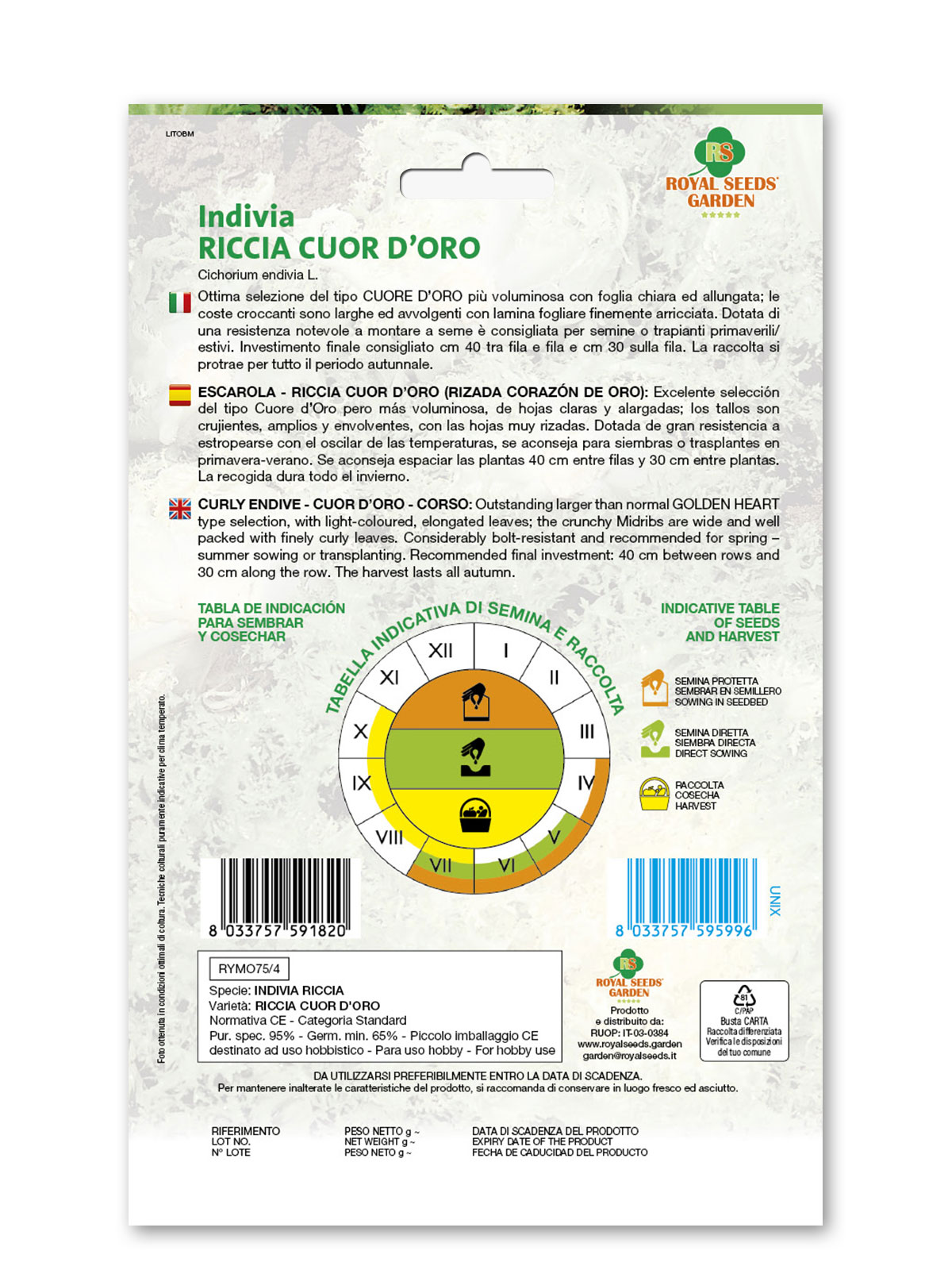 Indivia riccia cuor d’oro – Ottima selezione del tipo CUORE D’ORO più voluminosa con foglia chiara ed allungata; le coste croccanti sono larghe ed avvolgenti con lamina fogliare finemente arricciata. Dotata di una resistenza notevole a montare a seme è consigliata per semine o trapianti primaverili/estivi. Investimento finale consigliato cm 40 tra fila e fila e cm 30 sulla fila. La raccolta siprotrae per tutto il periodo autunnale.